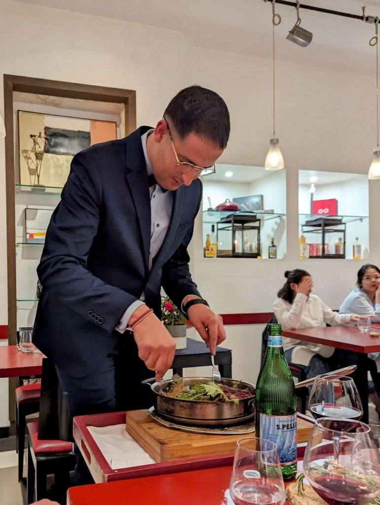 At the second floor, we took a long, dark hallway and were convinced that we couldn’t possibly be in the right place. Just then a door opened revealing a pleasant room with six tables and we were greeted warmly by a boy-faced young man in an apron and flowered shoes.