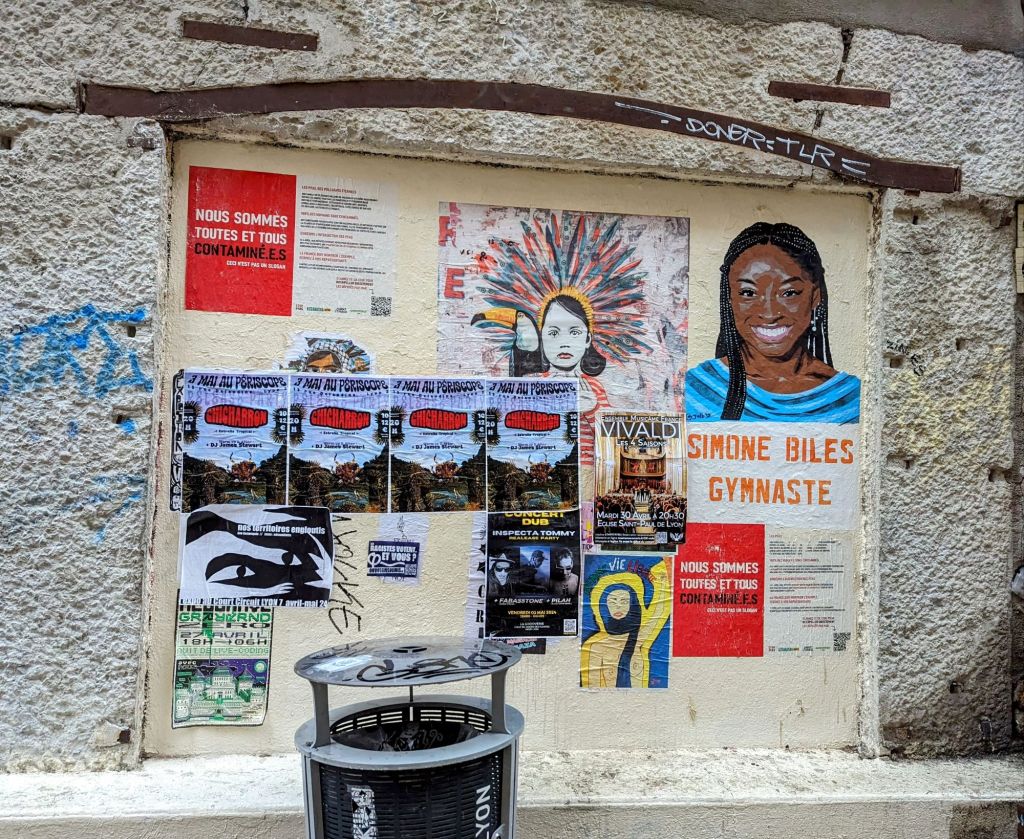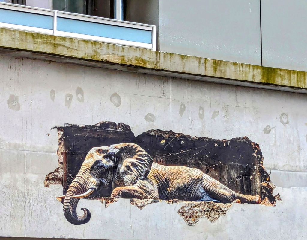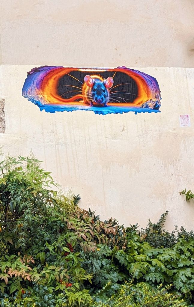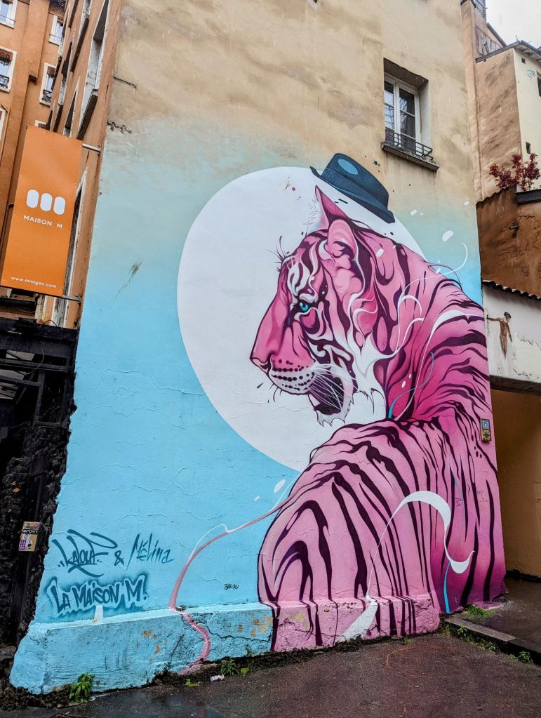 We learned that silk workers were some of the earliest organizers, often using what we call graffiti to voice their protests over poor working conditions and calls for reform. The tradition continues today with many political statements and other forms of advocacy and storytelling depicted in images and messages on ever-changing walls throughout the neighborhood. Animals are a favorite subject of Lyon’s public art.