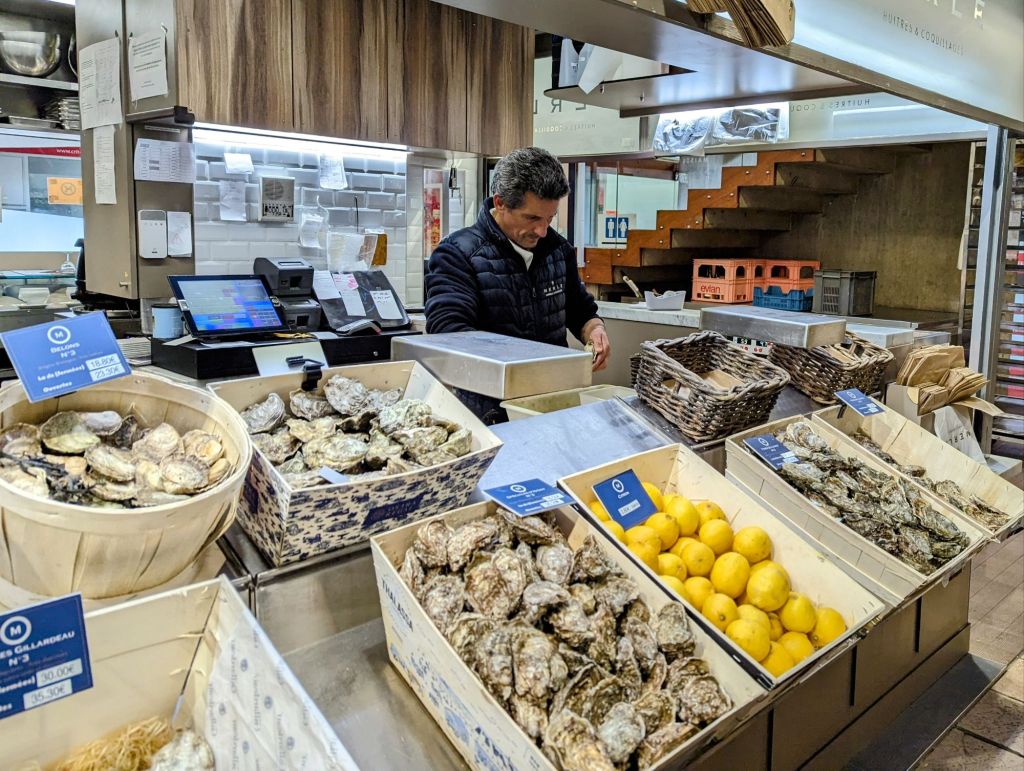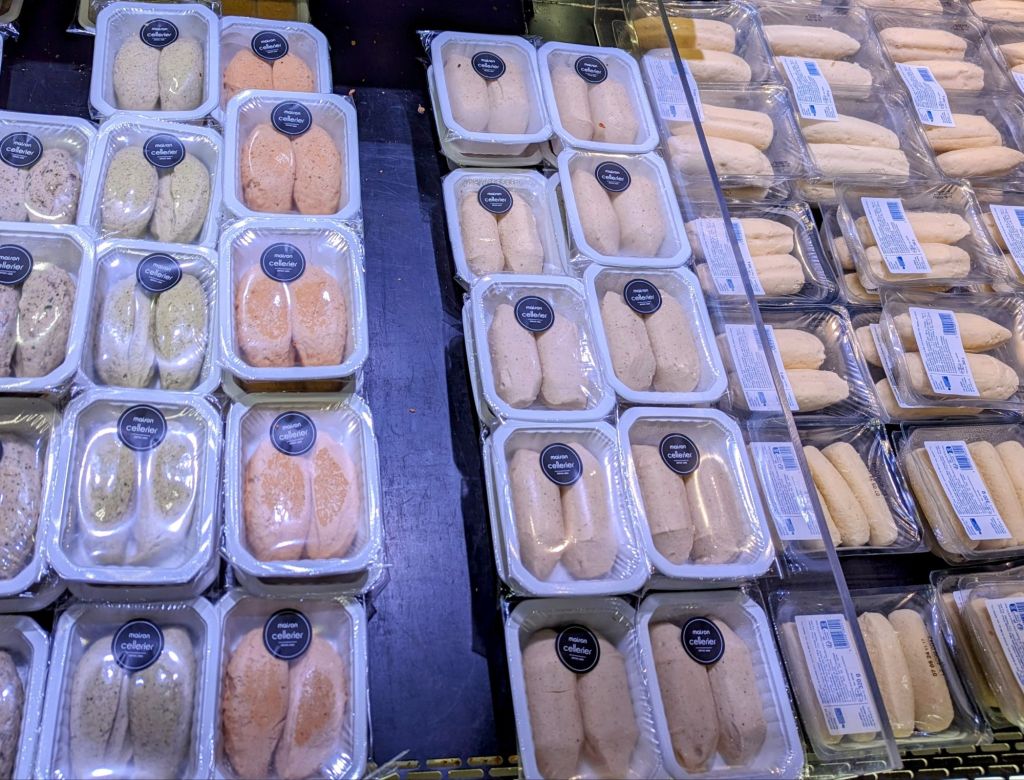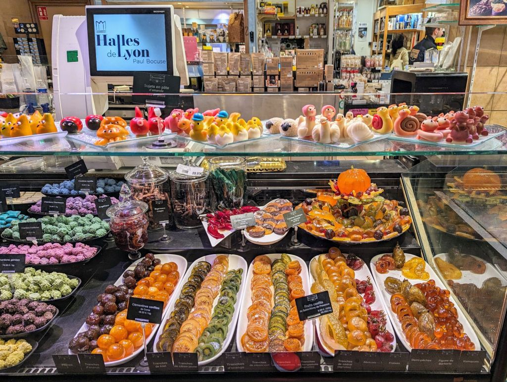 Our visit to the Halles de Lyon Paul Bocuse was a bit late to see local chefs carefully selecting ingredients for their next menus, but we got a feel for this incredible 56 vendor indoor market where the best of the best cheeses, breads, pastries, chocolates, fresh and dried meats and sausages, chickens from Bresse, and other gourmet delicacies are artfully displayed for the most discerning chefs. We also tasted some sweet treats and bought some chocolate to bring home.