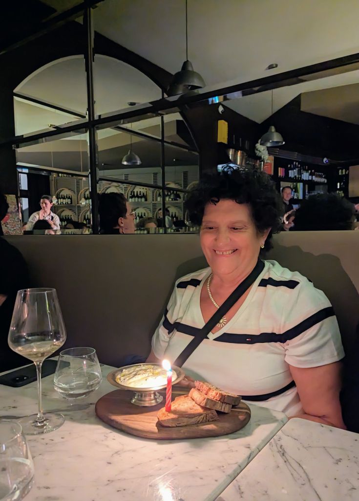 When it came time for dessert, the lights went out and the Theme from Star Wars came on through the speakers as a Happy Birthday for Darlene, who will celebrate a marker birthday with her Copenhagen family next week. She thought the power went out, but the whole room clapped for her!