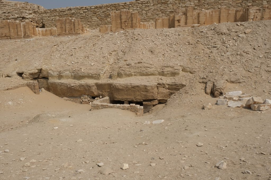 Sakkara Step Pyramid Sakkara tunnels Sakkara complex On their way to SakkaraFar in front of SakkaraThe necropolis is accessed by a collonade entrance which is flanked by stone columns in the shape of bundles of papyrus. When we were there, a puppy was sitting at the farm end, enjoying a rare bit of shade.