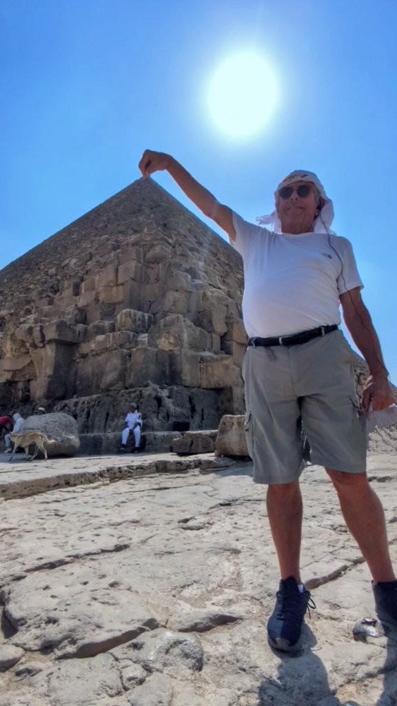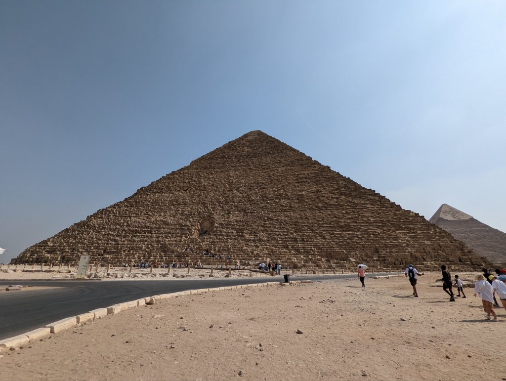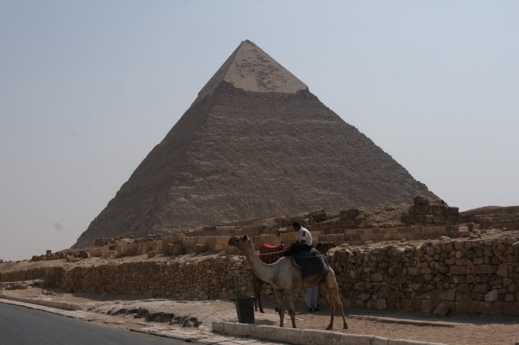 The Great Pyramid of Khufu with Khafre peeking out Main Entrance Side viewPyramid of KhafreAll three pyramids All three pyramidsPerhaps he’s had too much sun!