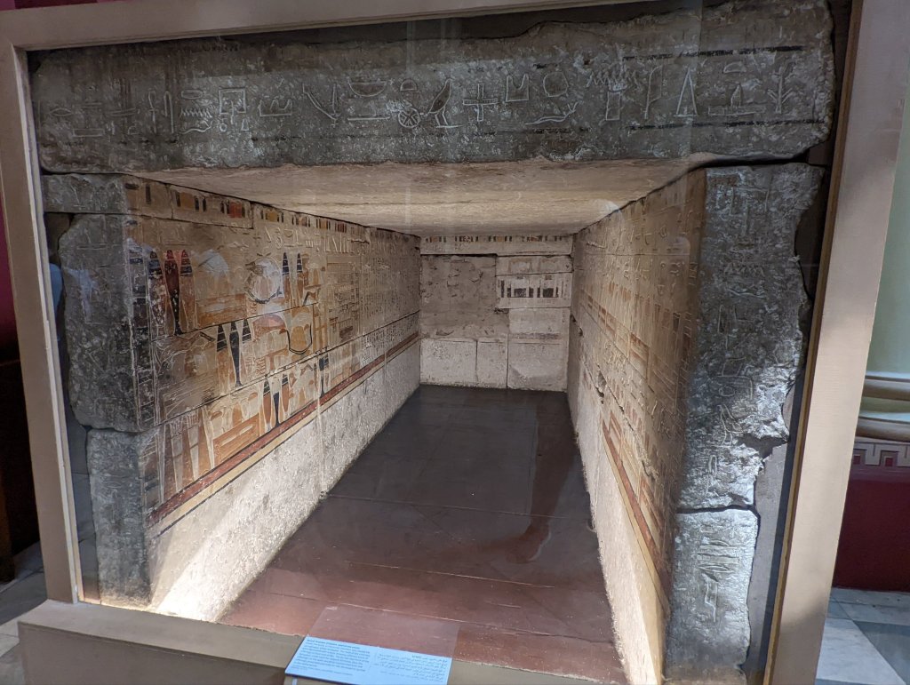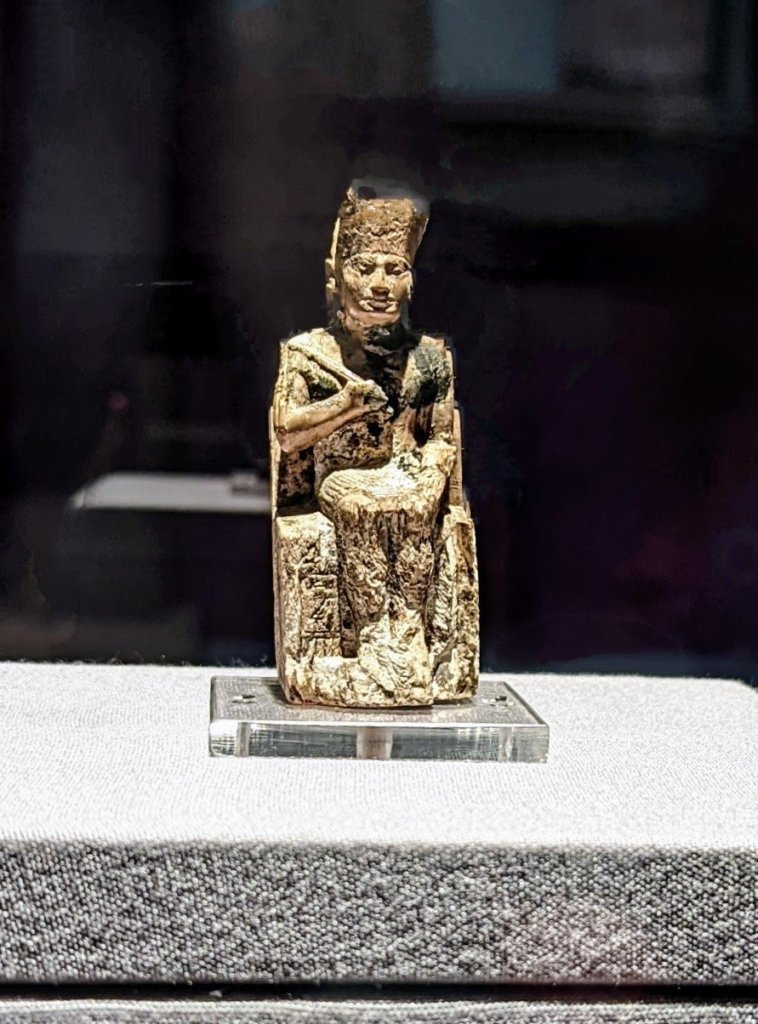The lotus and papyrus pond at the museum entrance reflects Egyptian prosperity and royalty. Images of both are found in many of the antiquities.The actual burial chamber of Deshri, chief of the estate in around 2100 BC. The walls are decorated with images of ordinary items like food and drinks that could be transformed to meet his needs in the netherworld.The oldest known life-size Egyptian statue representing King Djoser (2649-2630 BC)Statue of Pharaoh Khafre (2520-2499 BC) with the god Hours depicted as a falcon to protect his backsideStatuette of Khufu, builder of the Great Pyramids of Giza. At 4″ tall, it is the smallest ivory statue in the museum, but one of the most significant.The throne of King TutankhamunAnubis, god of the dead, is the most famous depiction of a jackal which guarded the tomb.