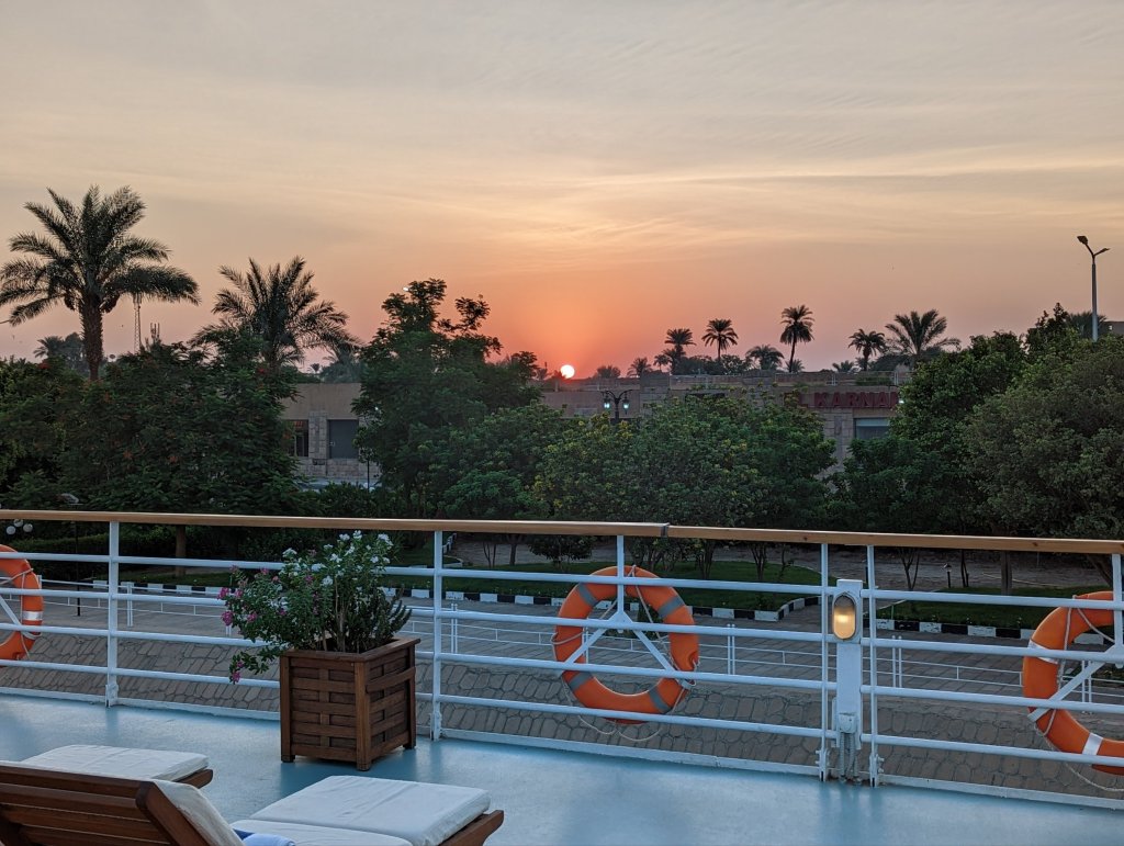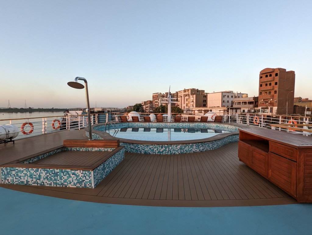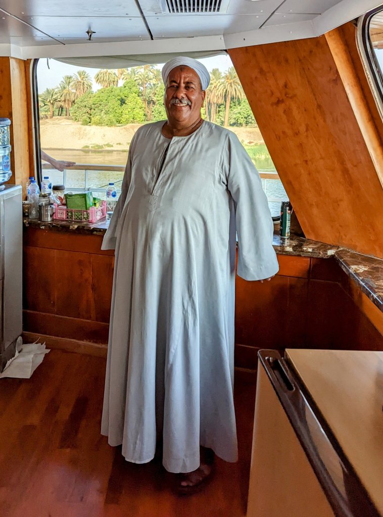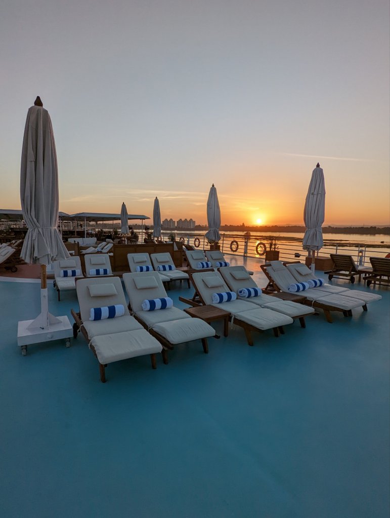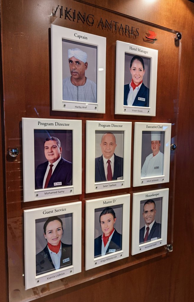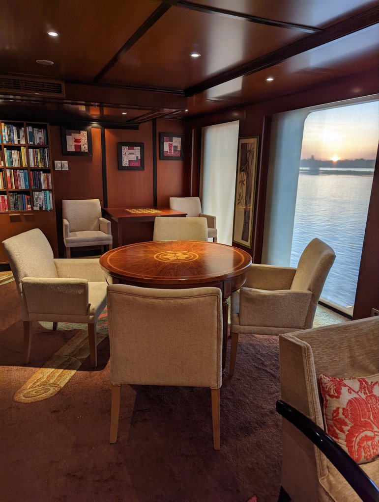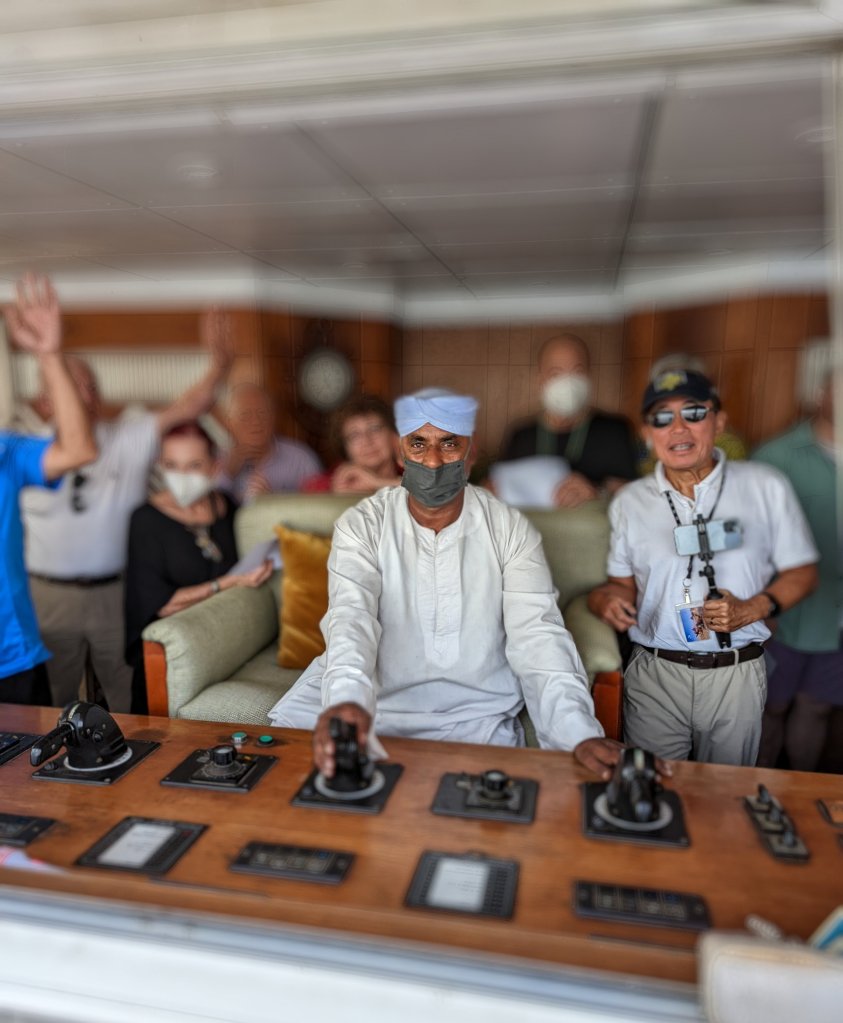These are the people who make the magic happen on the Nile: First Captain Harby Aref; Hotel Manager Vivien Koszo; Program Directors Mohamed Samy (our group leader) and Salah Tawfeek; Executive Chef Paul Jackowski; Guest Services Ksenia Liubova; Maitre D’ Kinga Mikolajezyk; and Head Housekeeper Mohamed Selah. Each one led an incredible team that resulted in one of our best travel experiences to date. Main Lobby Any time of the day or night, the reception desk staff is ready and waiting to help with anything at all.The Lounge where everything happens … cocktail parties, port talks, lectures, entertainment, and just a warm, relaxing venueAnother view of the LoungeCoffee Corner with warm pastries at 5am and cookies all day. Papa Latte’s favorite place.Cozy nook on the lower levelCaptain Aref with over 50 years of experience navigating the Nile. He learned from his father starting when he was a boy. He doesn’t use any instruments, instead navigating by experience, even through the locks near Aswan. It was a smooth ride!The Second Captain was at the helm during our bridge tour Captain’s relaxation couchDoug had to try it out…he was hoping for a job offer!View from the Bridge…smooth sailing ahead Gift Shop with some unique Egyptian itemsMulti-purpose Room with books, game table and comfy chairsSalon and SpaSunrise on the Sun DeckPool and Outdoor ShowerSun Deck Lounging AreaThe Dining Room where three delicious meals are served every day. Chefs Paul’s soups are legendary! He’s from Poland, but his entire staff is Egyptian making for some interesting twists on traditional dishes.