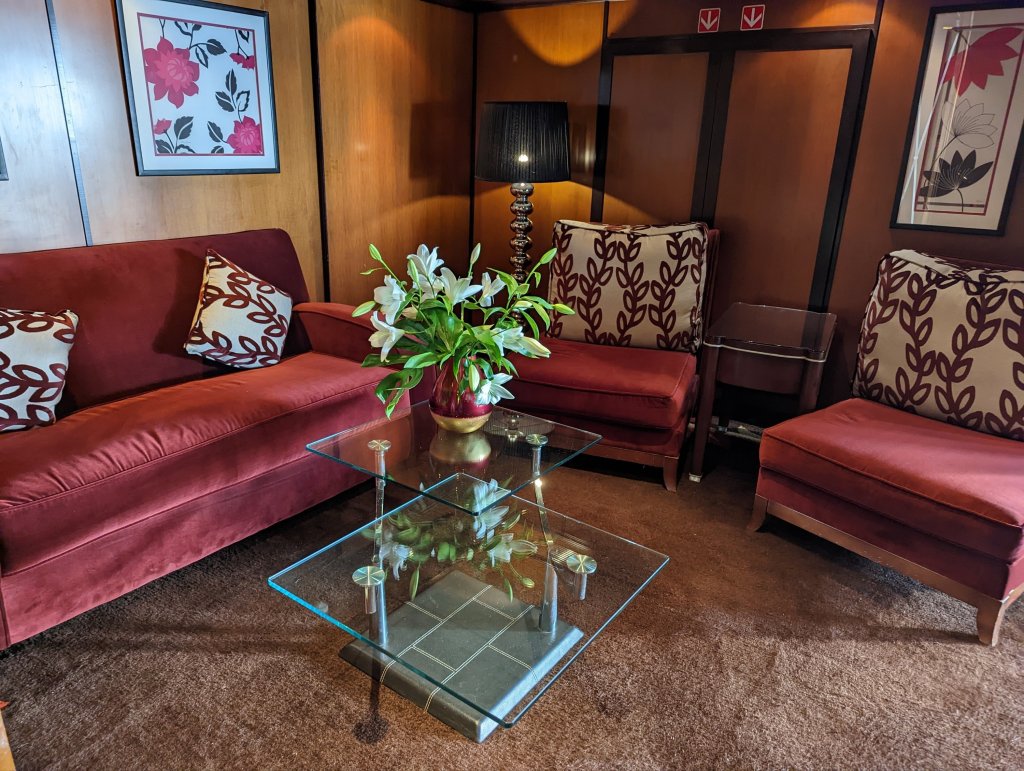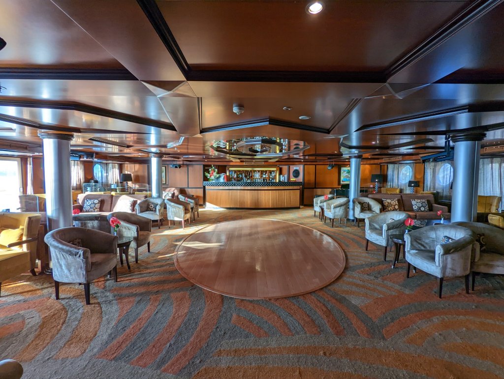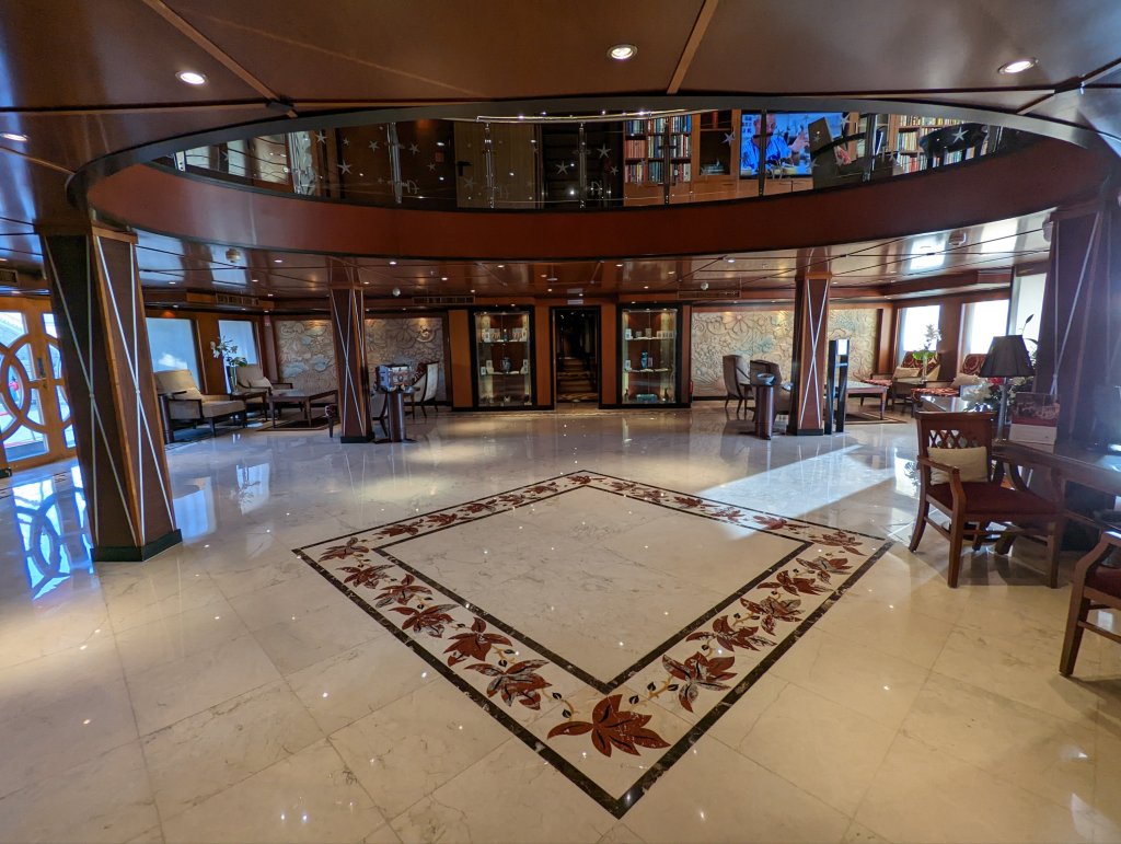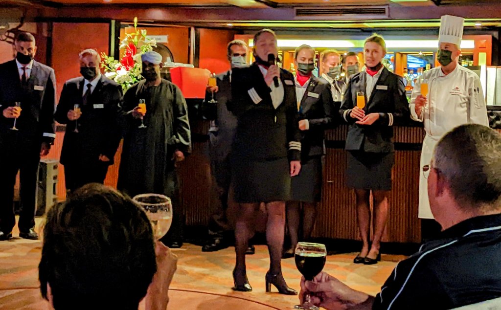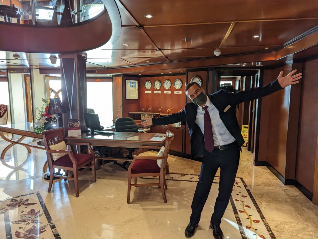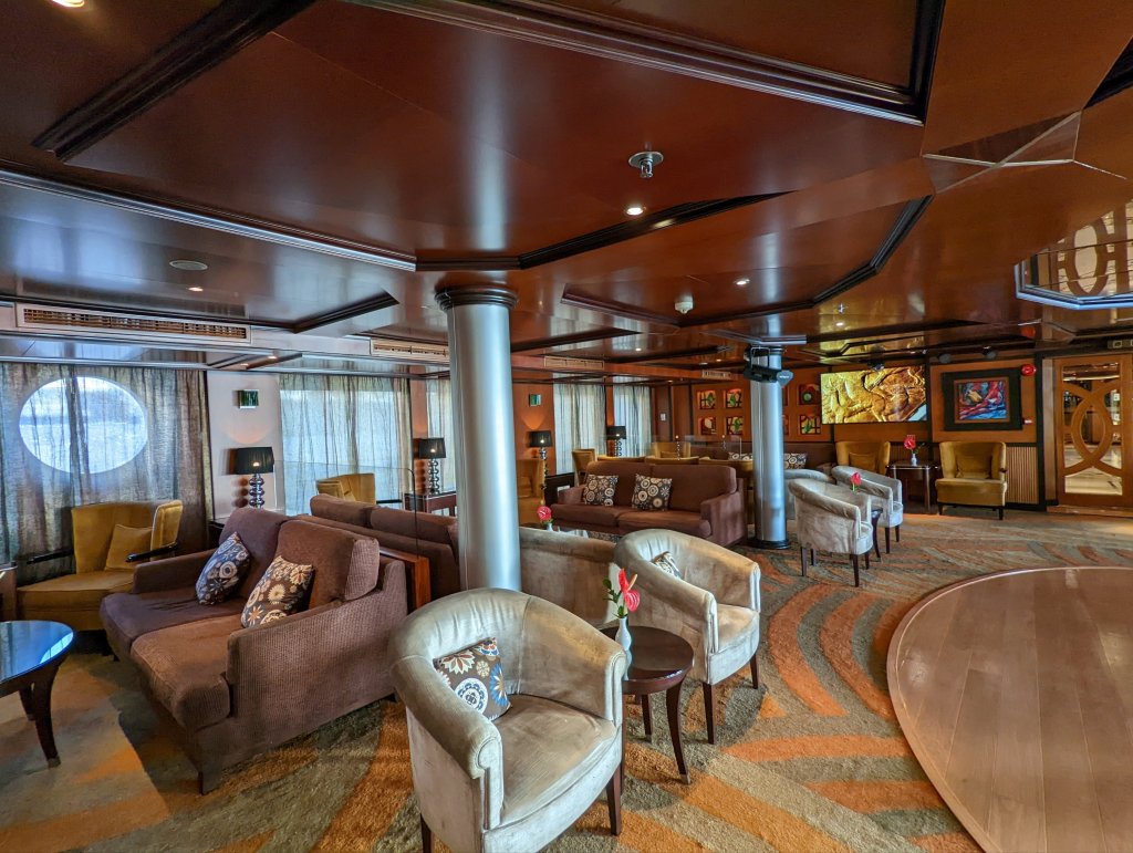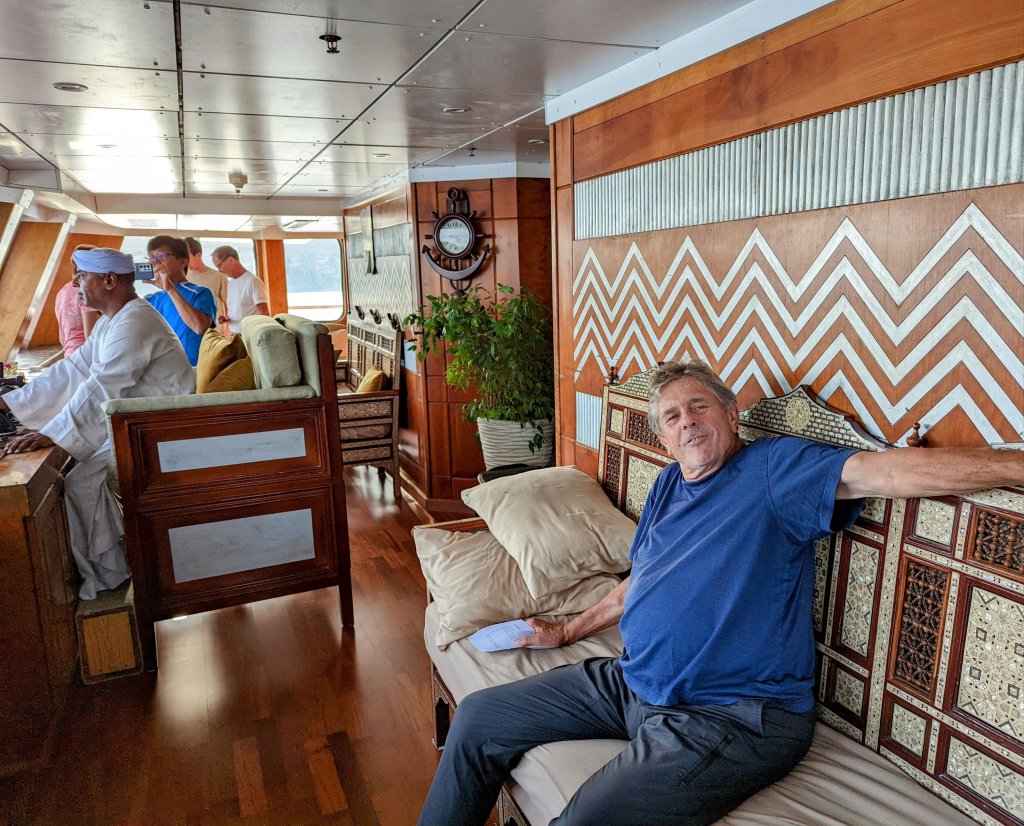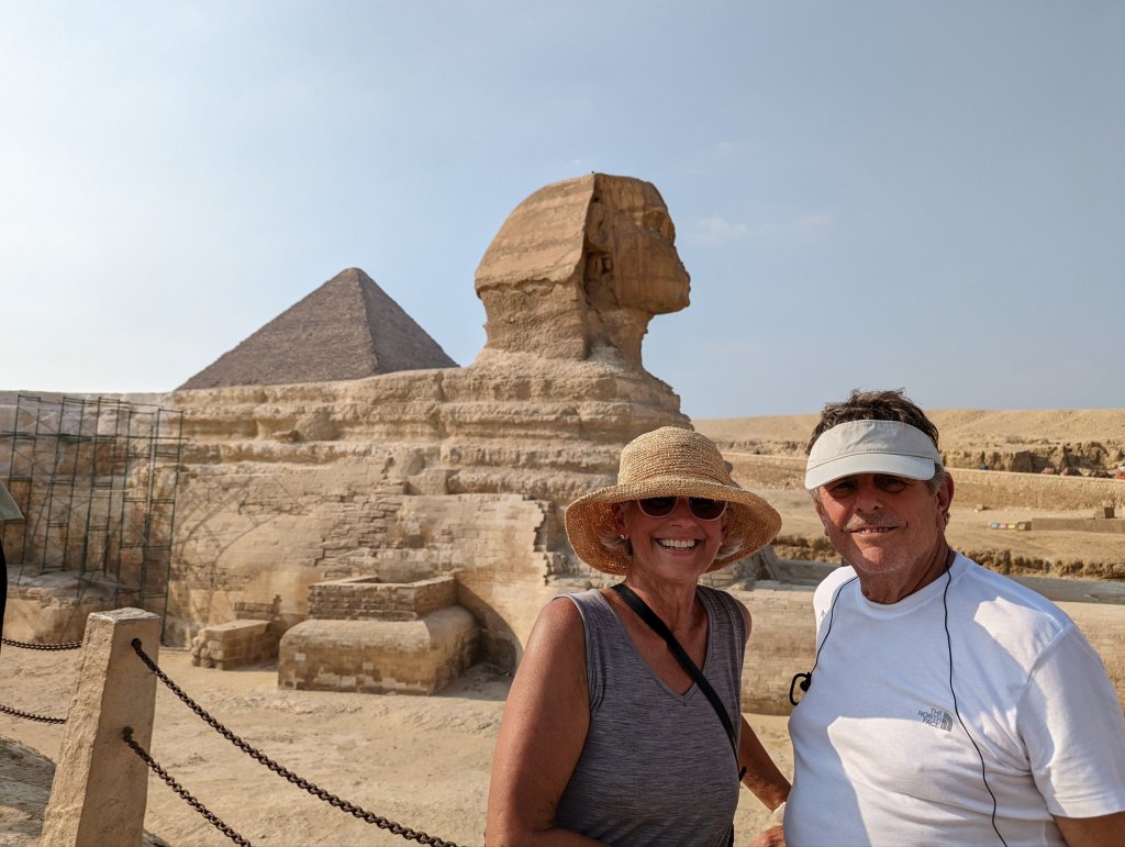 These are the people who make the magic happen on the Nile: First Captain Harby Aref; Hotel Manager Vivien Koszo; Program Directors Mohamed Samy (our group leader) and Salah Tawfeek; Executive Chef Paul Jackowski; Guest Services Ksenia Liubova; Maitre D’ Kinga Mikolajezyk; and Head Housekeeper Mohamed Selah. Each one led an incredible team that resulted in one of our best travel experiences to date. Main Lobby Any time of the day or night, the reception desk staff is ready and waiting to help with anything at all.The Lounge where everything happens … cocktail parties, port talks, lectures, entertainment, and just a warm, relaxing venueAnother view of the LoungeCoffee Corner with warm pastries at 5am and cookies all day. Papa Latte’s favorite place.Cozy nook on the lower levelCaptain Aref with over 50 years of experience navigating the Nile. He learned from his father starting when he was a boy. He doesn’t use any instruments, instead navigating by experience, even through the locks near Aswan. It was a smooth ride!The Second Captain was at the helm during our bridge tour Captain’s relaxation couchDoug had to try it out…he was hoping for a job offer!View from the Bridge…smooth sailing ahead Gift Shop with some unique Egyptian itemsMulti-purpose Room with books, game table and comfy chairsSalon and SpaSunrise on the Sun DeckPool and Outdoor ShowerSun Deck Lounging AreaThe Dining Room where three delicious meals are served every day. Chefs Paul’s soups are legendary! He’s from Poland, but his entire staff is Egyptian making for some interesting twists on traditional dishes.
