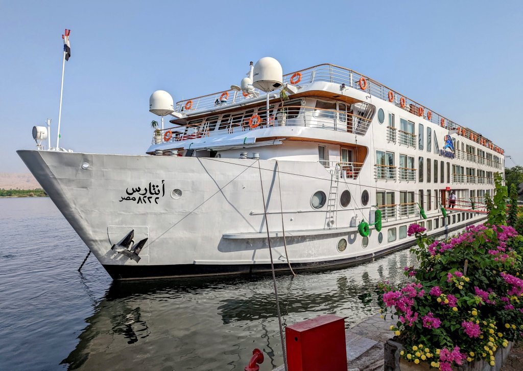 As we pack up to head home tomorrow, we would be remiss if we didn’t share something about our cruise boat, the Viking Antares. This lovely Egyptian vessel was built in 2007 according to the standards and specifications of Germanishcer of Lloyd’s. She has 3 propellers made by Rolls Royce and 3 engines made by Caterpillar. She’s 236 feet long, 47.5 feet wide, 38 feet high. She can cruise at 12.5 mph with the current and 10 mph against. She’s beautiful, comfortable, and cozy with a maximum capacity of 62 passengers. We cruised with a group of 57…plus those who followed along with this blog. To you we say thank you and hope you’ve enjoyed this trip as much as we have!
