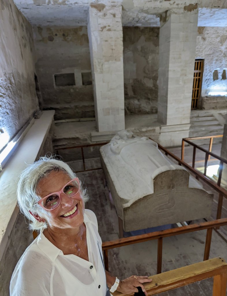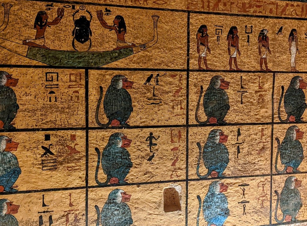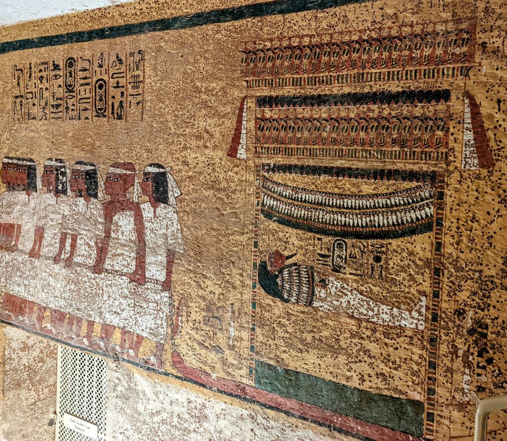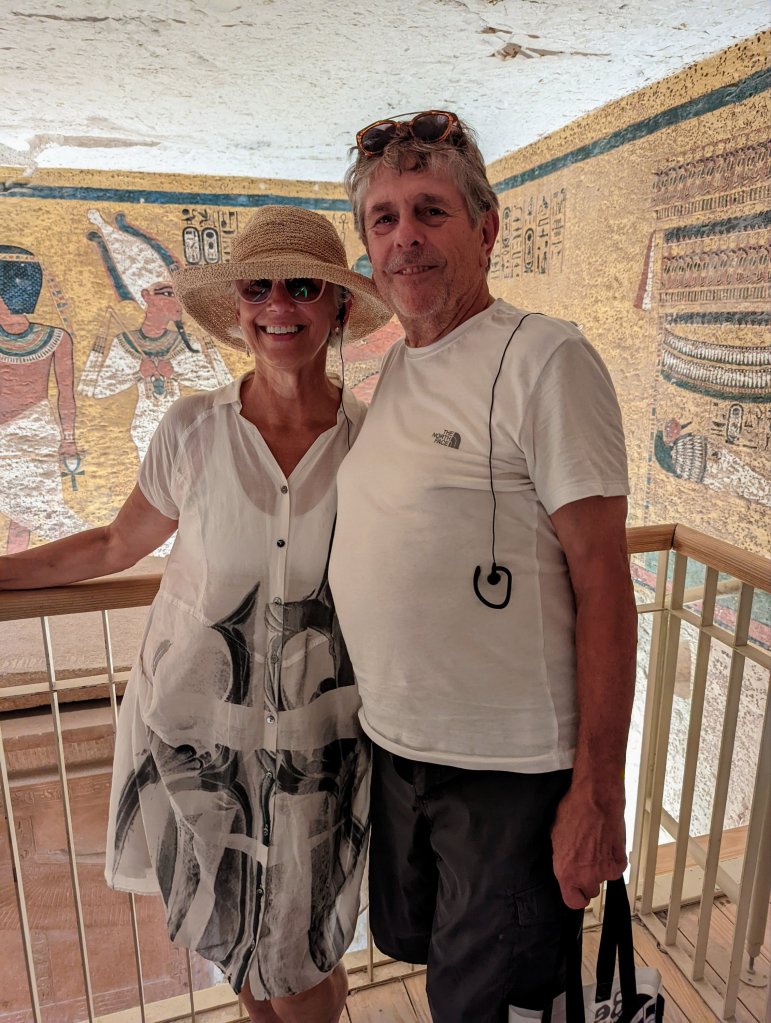 When King Tutankhamun died at age 19, an existing tomb was adapted for his burial. Only the burial chamber itself was painted, with scenes of his journey into the afterlife. Over 3,330 years old, the colors are still vibrant. It is considered the best preserved tomb ever found. Visitors are restricted to prevent further deterioration. The treasures have all been moved to Cairo museums, and some are in other places around the world. Today, only his mummy, the outermost of his three nested coffins, and its lid remain in the tomb. We were thrilled to be able to visit his tomb during the 100th anniversary of its discovery.