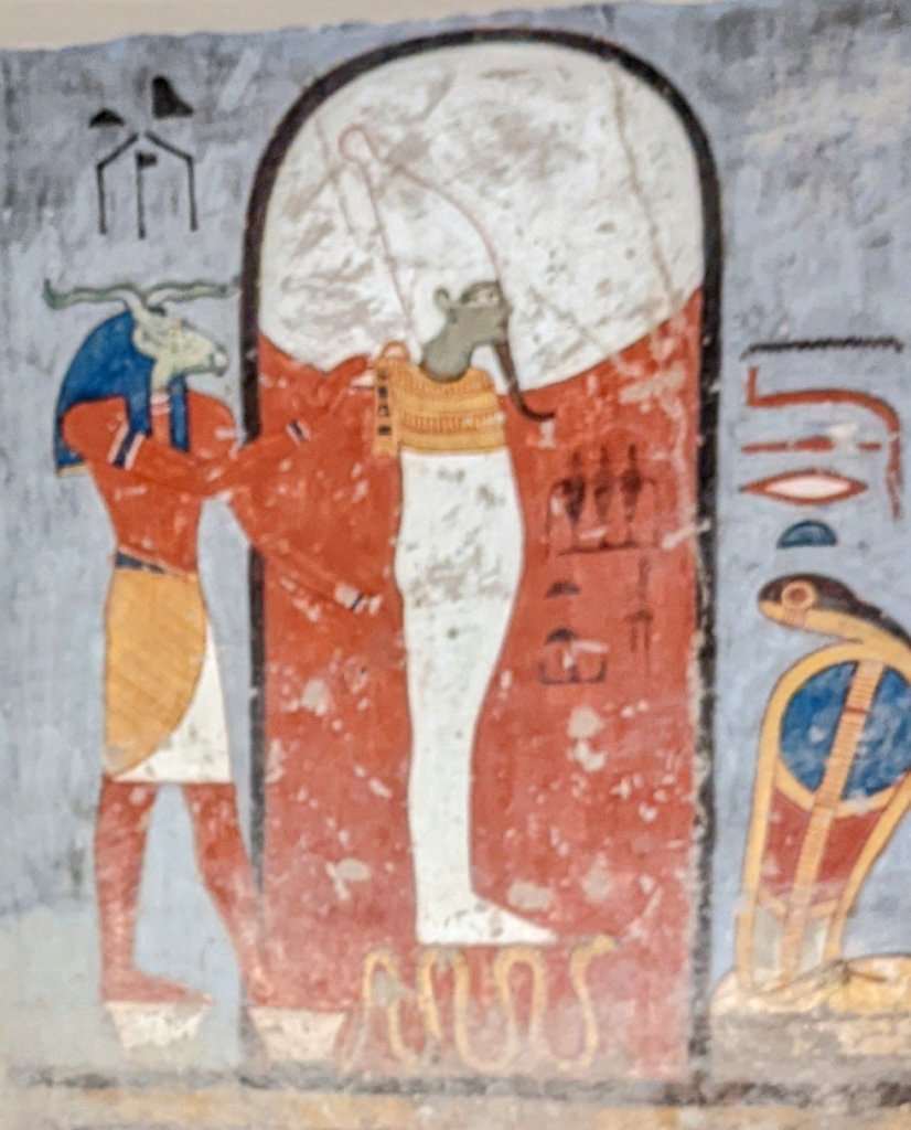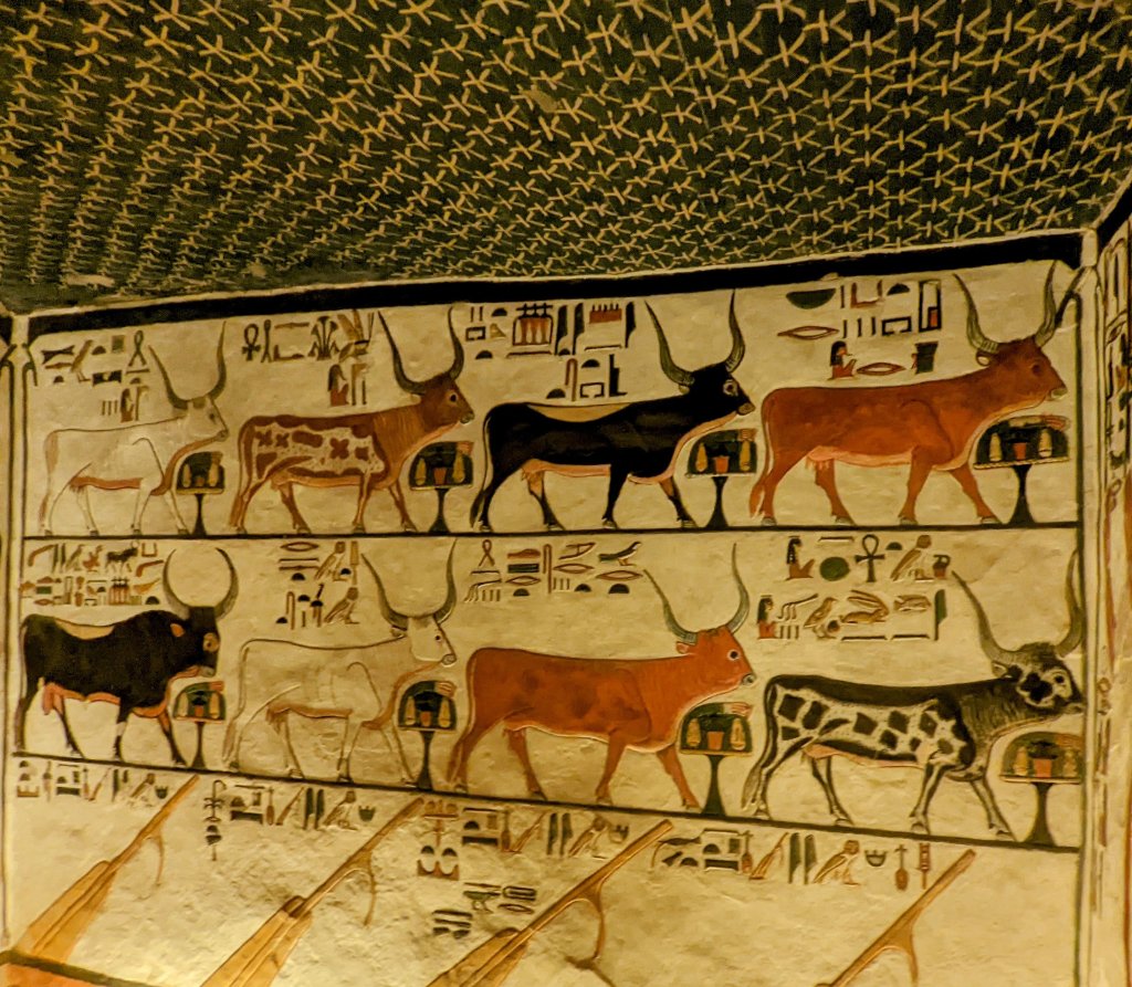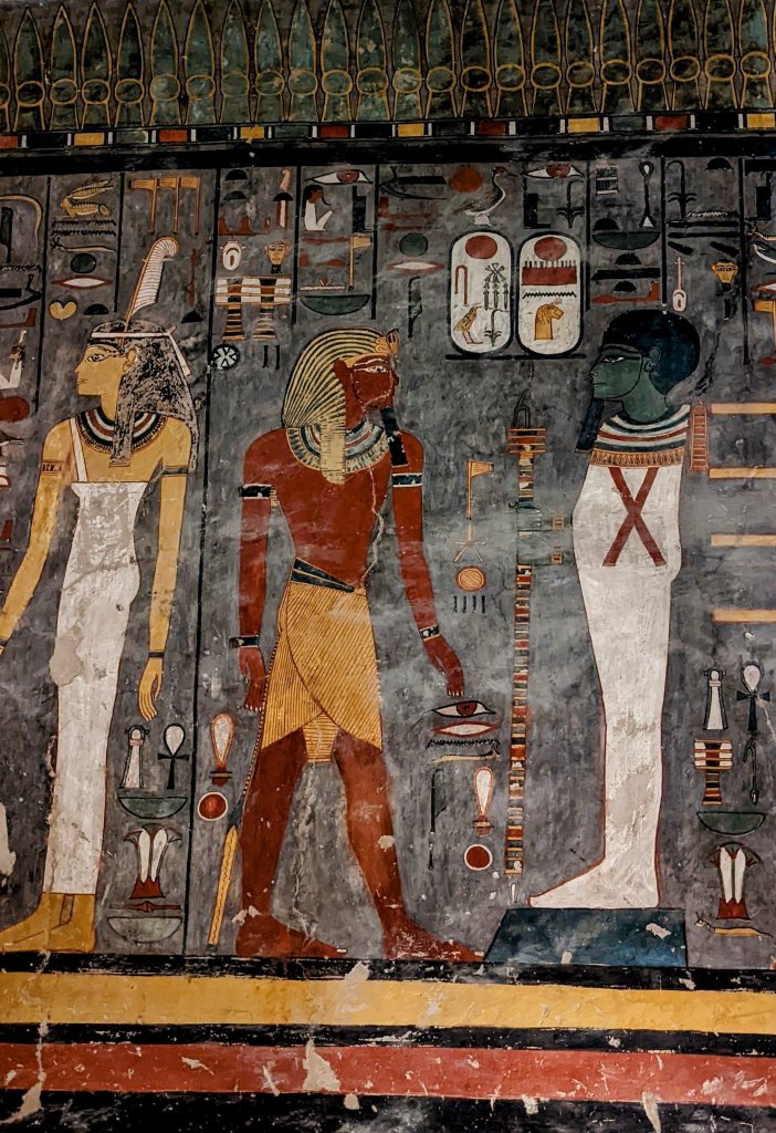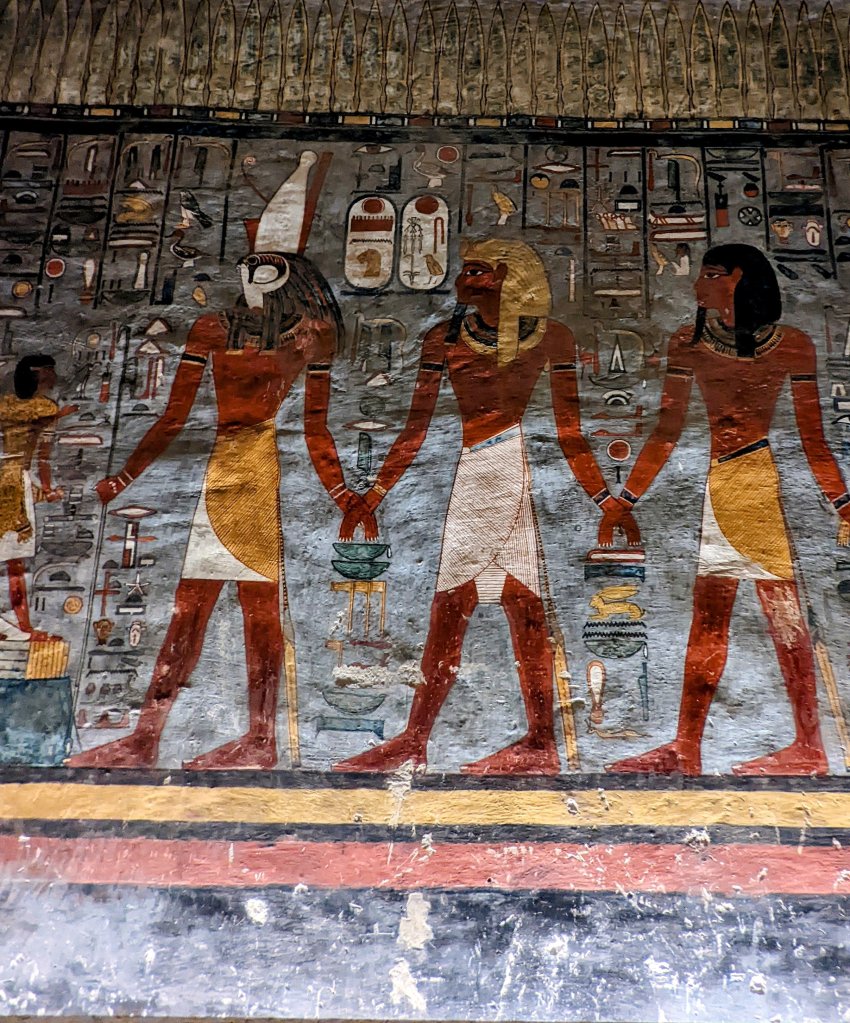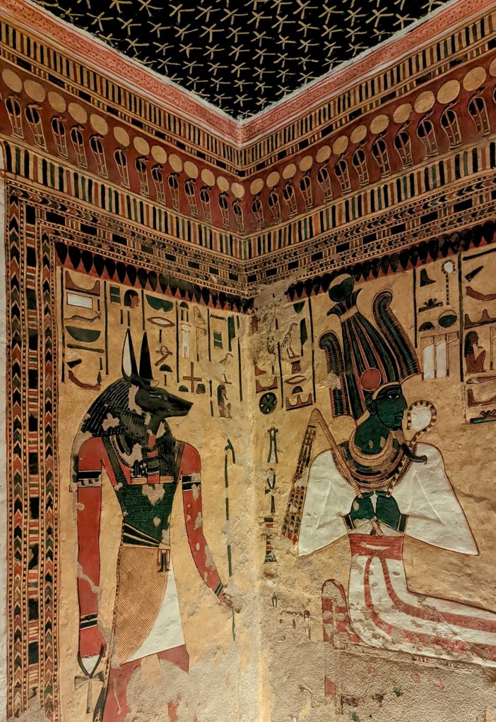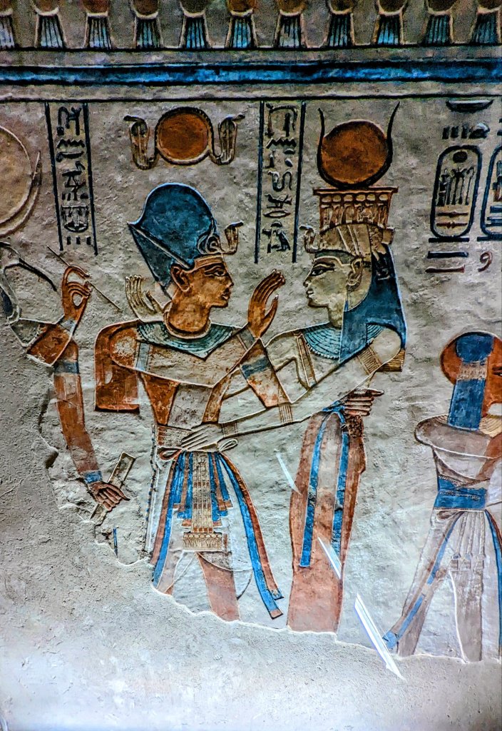 The largest and most elaborate of the tombs is that of Queen Nefertari, first of Pharaoh Ramses II (Ramses the Great)’s eight wives. Married at age 13, Nefertari had at least six children during their 24 year marriage. He called her “beautiful companion” and “the one for whom the sun shines.” Her tomb was discovered in 1904 by Ernesto Schiaparelli. It has intense color, with a ceiling painted deep blue and lined with stars. The walls are covered with elaborate imagery. It was badly deteriorated over the years, and was closed for restoration from the 1950’s until 1995. It was closed again from 2003-2016, and now has only limited visitation. Cameras are not allowed, and only cell phone cameras with no video and no flash can be brought into the tomb. The vivid walls depict her journey through the underworld. It is truly magnificent!