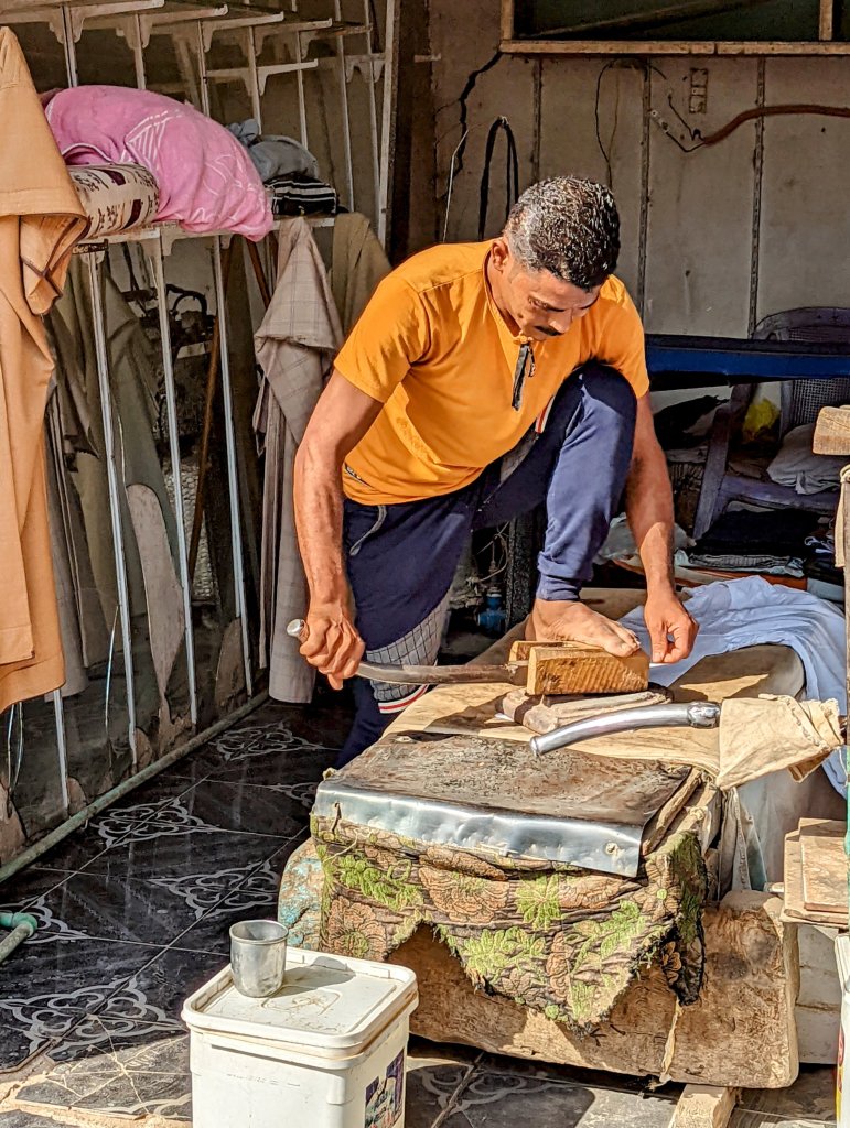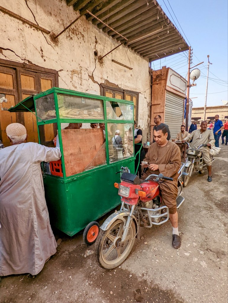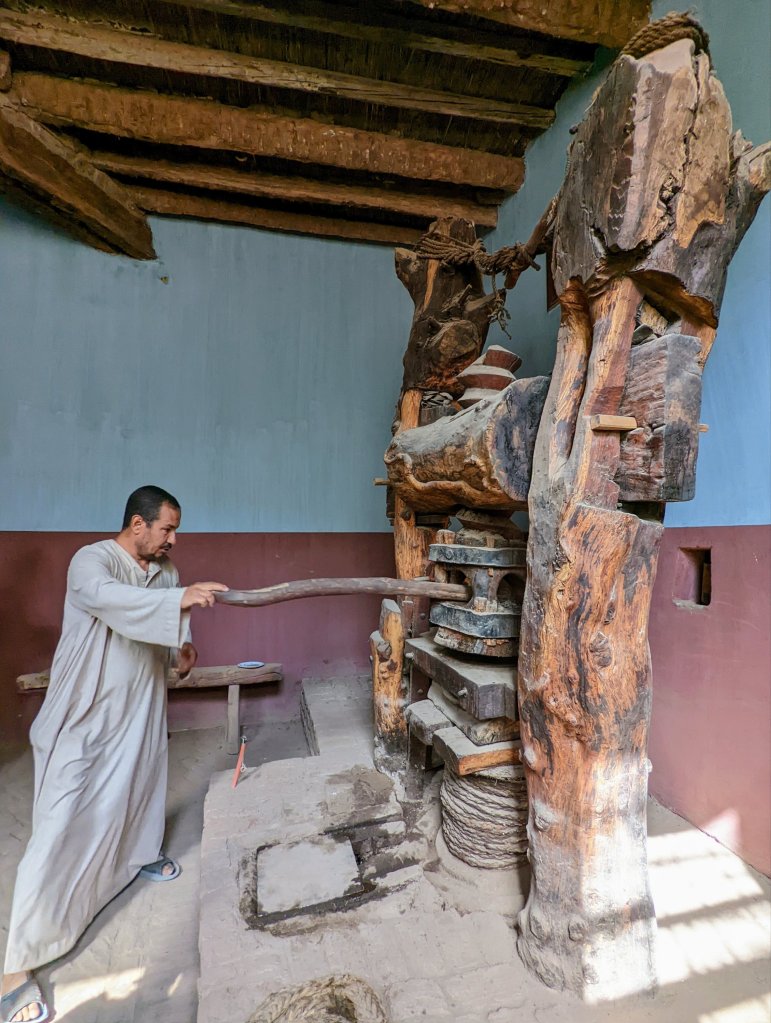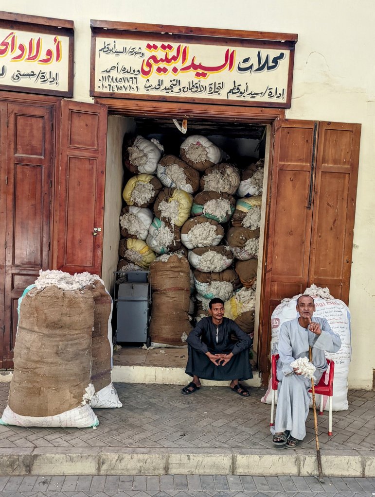 When I woke up, the call to prayer was coming from one of the oldest minarets in EgyptIt was Sunday morning, and the local Coptic Christian Church was full so we couldn’t go insideLooking out onto a plazaThis gentleman was pressing a galibaya using a hot iron and his foot! He sprinkled the cotton garment by taking a mouthful of water from the cup and spraying it all over the fabricThe tailor reminded me of my grandfather who was a tailor and my dad who taught me to sew.Falafel drive-thruThese men make seals so that people who couldn’t write could “sign” their documents.This cotton will be used to stuff mattresses and pillows.And this beautiful fabric will be turned into clothing.Doug jumped right in to help press oil the natural way The oil is then put through this machine to filter it.Fresh pita is made in wood-fired ovensAnd these little guys had their pet goat out for a walkAlthough in need of some tlc, many of the buildings in Esna have an Art Deco flair