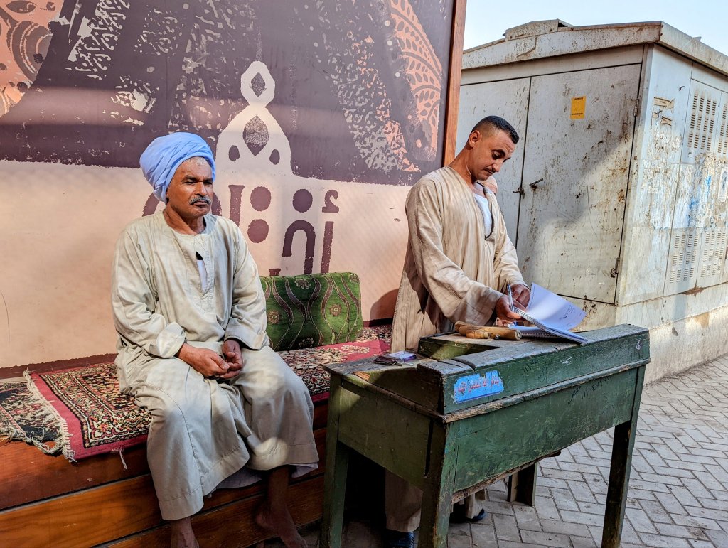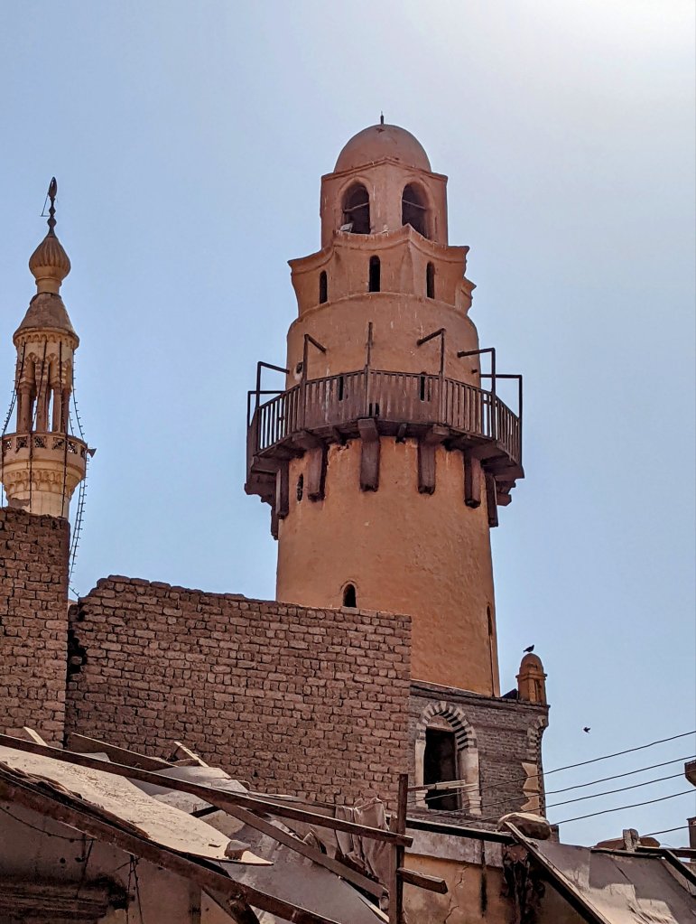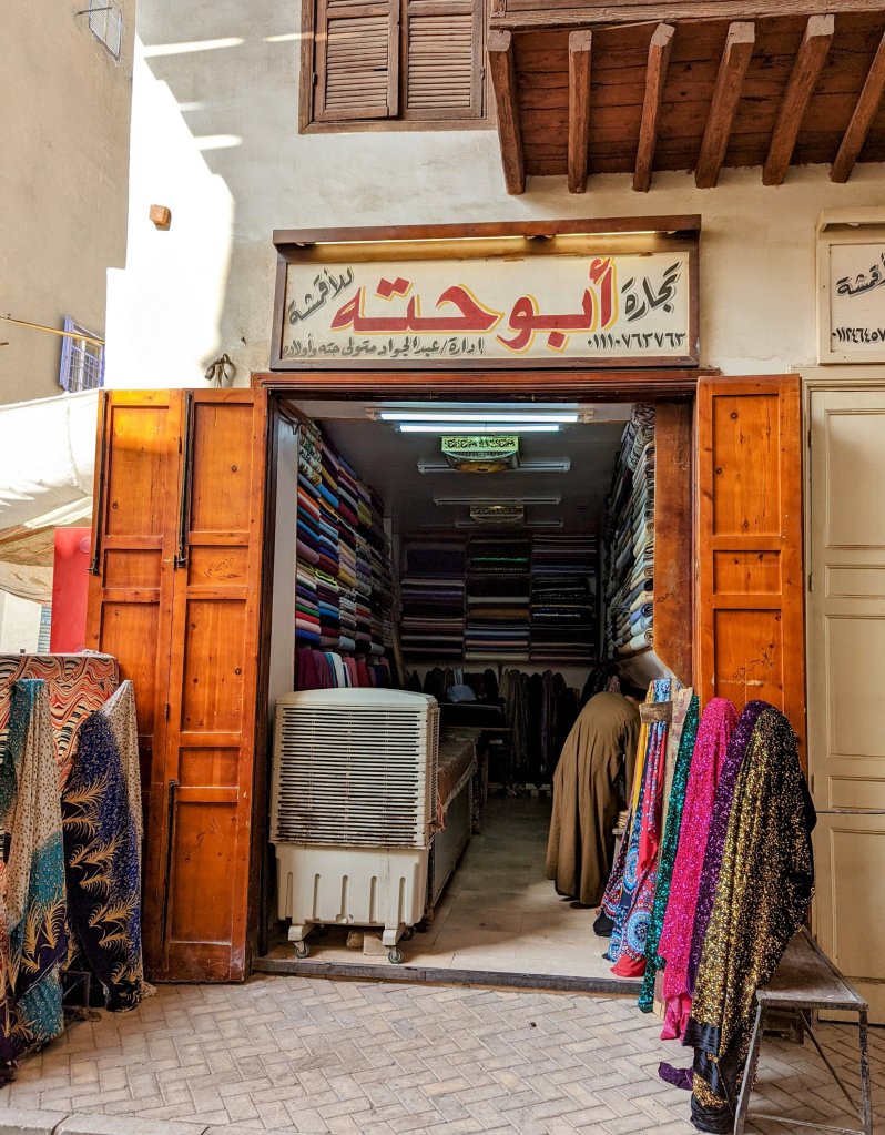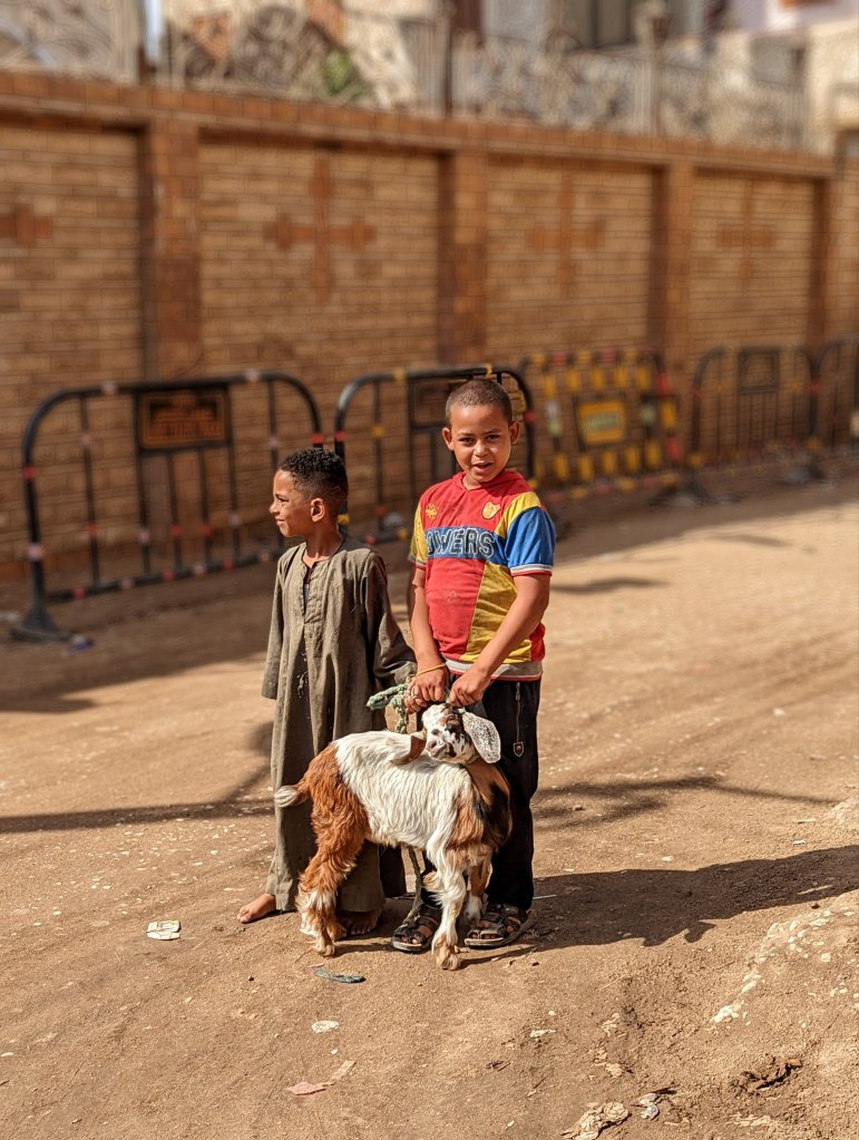 When I woke up, the call to prayer was coming from one of the oldest minarets in EgyptIt was Sunday morning, and the local Coptic Christian Church was full so we couldn’t go insideLooking out onto a plazaThis gentleman was pressing a galibaya using a hot iron and his foot! He sprinkled the cotton garment by taking a mouthful of water from the cup and spraying it all over the fabricThe tailor reminded me of my grandfather who was a tailor and my dad who taught me to sew.Falafel drive-thruThese men make seals so that people who couldn’t write could “sign” their documents.This cotton will be used to stuff mattresses and pillows.And this beautiful fabric will be turned into clothing.Doug jumped right in to help press oil the natural way The oil is then put through this machine to filter it.Fresh pita is made in wood-fired ovensAnd these little guys had their pet goat out for a walkAlthough in need of some tlc, many of the buildings in Esna have an Art Deco flair