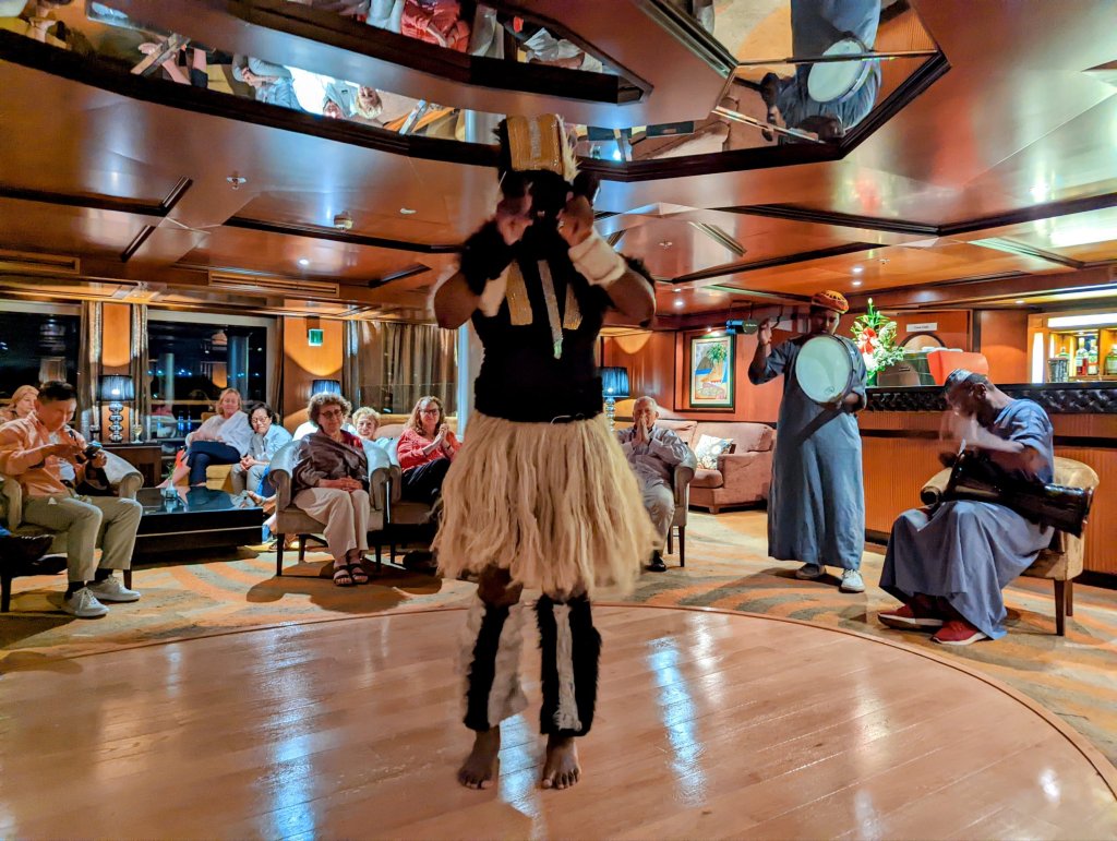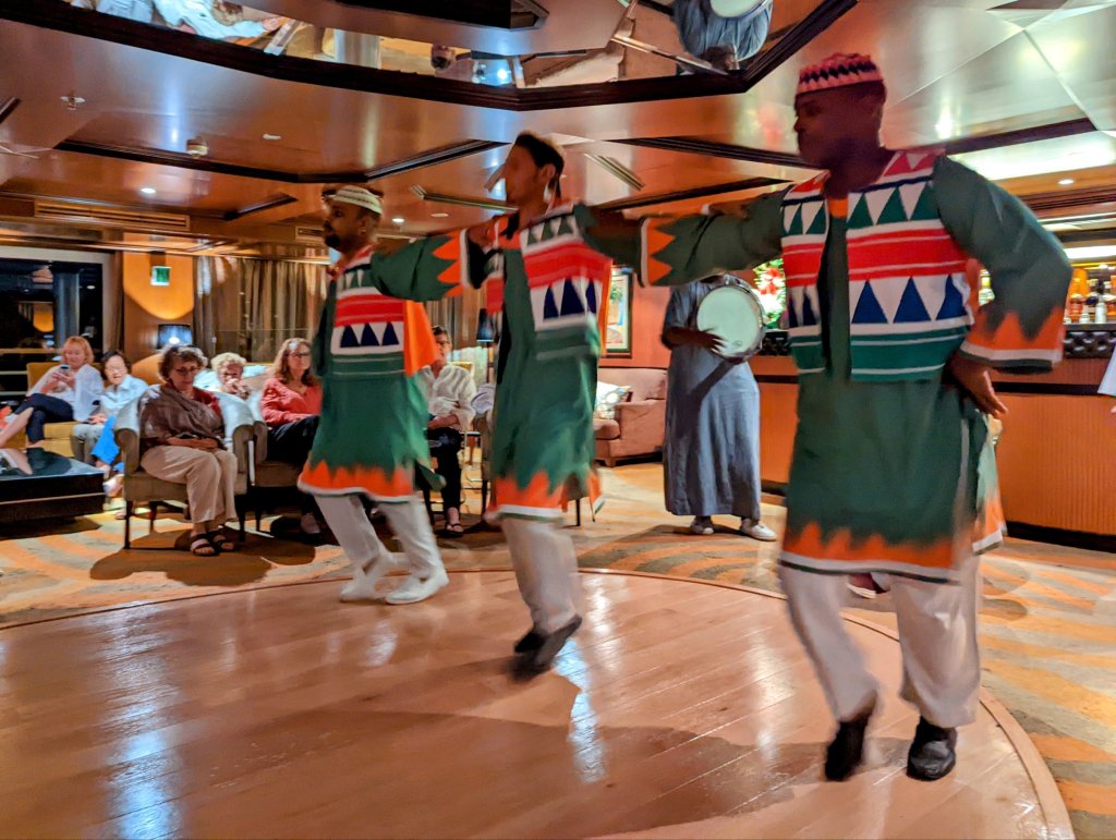The entertainment is amazing! In addition to the lounge pianist, different groups came onboard to enrich us with traditional music and dance. The Whirling Dervish show was spectacular! And the Nubian singers and dancers on Egyptian Night added a chance for lively “audience participation.” So much fun!