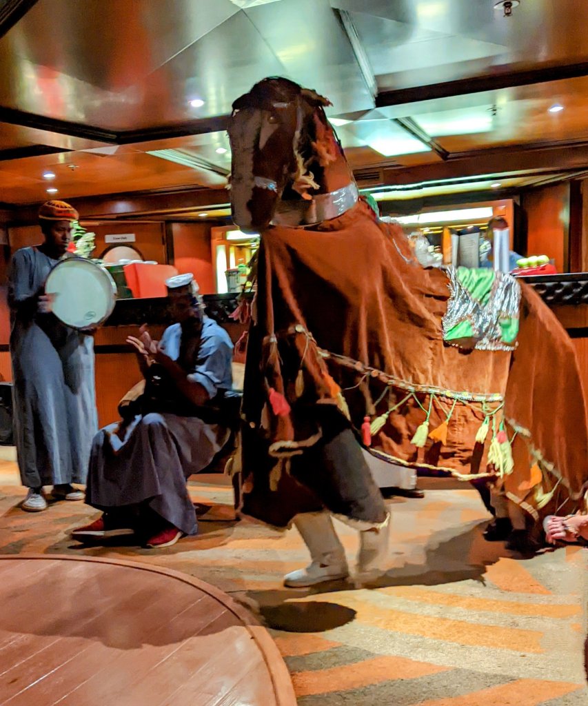 Dervish RamadanThen he lit up!The Dervish Band Achmed, Achmed, and Achmed Nubian performers wore traditional costumes and danced in perfect unison “Temptations style!”The Nubian horse gave me a kiss!Nubian chief…we both danced and chanted with him. He really got the audience going! His song was “Proud I am of my Nubian culture” translated by our guide.