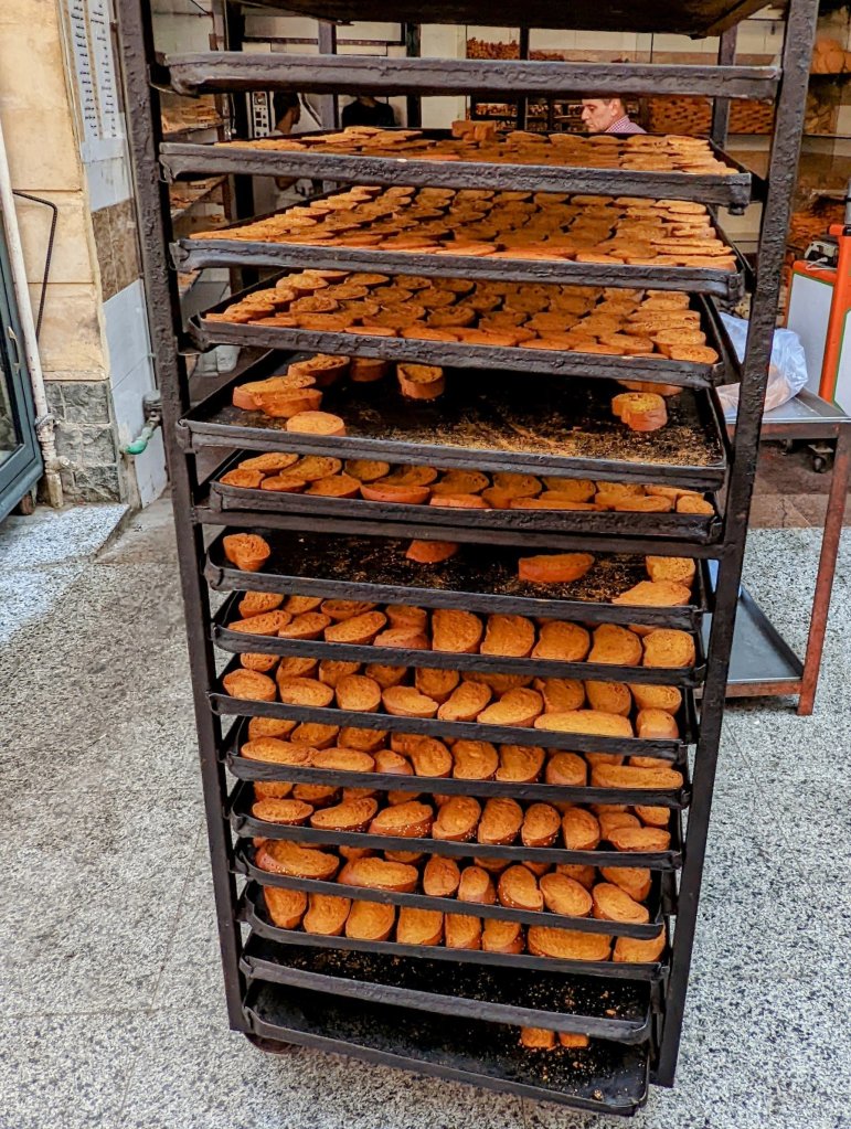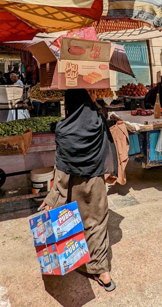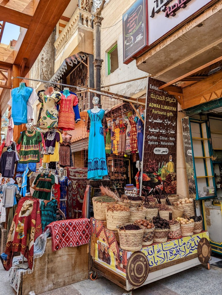 Spices on the tourist sideWoven items and dried herbs that can be packaged for touristsAttractive signs for tourists are often written in Arabic and EnglishFresh produce on the local sideShoppers often carry their purchases on their heads This bakery rack smelled delicious!