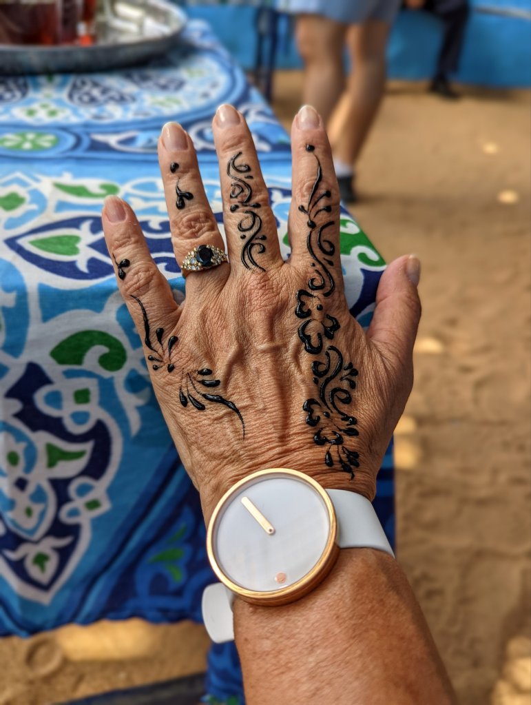 Although they lost so much, today’s Nubian families are working hard to carry on the traditions of their ancient ancestors. Many of their homes are built in a traditional domed style with vibrant colors in geometric patterns. We had the privilege of visiting one of their villages, where we were treated to a home visit as well as a stop at a local preschool. We received a warm welcome with traditional hibiscus tea; jabana coffee prepared with Sudanese coffee beans, ginger, and sugar; and a sweet homemade bread. The rhythmic sounds of drums and the rababa, a bowed, stringed instrument, filled the air with traditional Nubian music. And I treated myself to a beautiful botanical henna design, done by one of the local women to match hers.