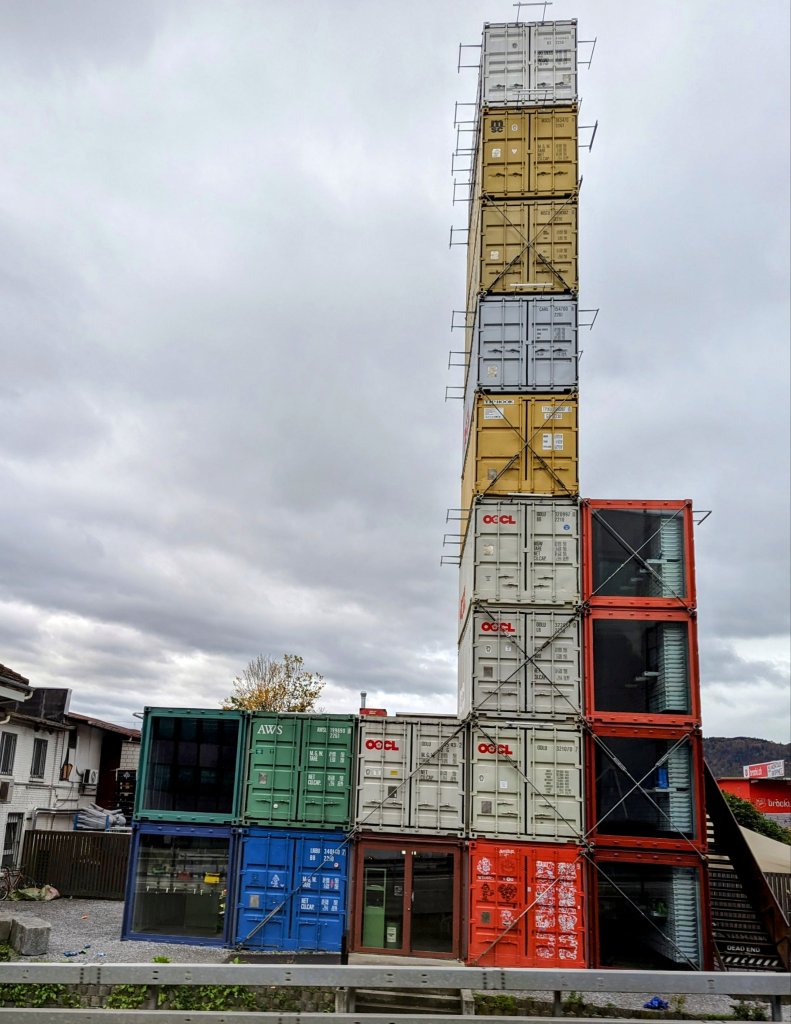 A park at the confluence of the Limmat and Sihl Rivers which flow through ZurichVery clever use of containers to build the Freitag Flagship Store Excellent public transportation, including the Tram which took us all over town