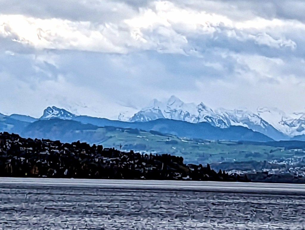 From top left: A little soggy; windsurfer; Tina Turner’s house (the grey one…caretaker lived in the boathouse!); small towns; lakeside churches; the Alps