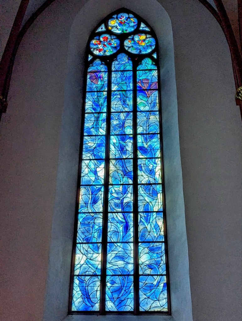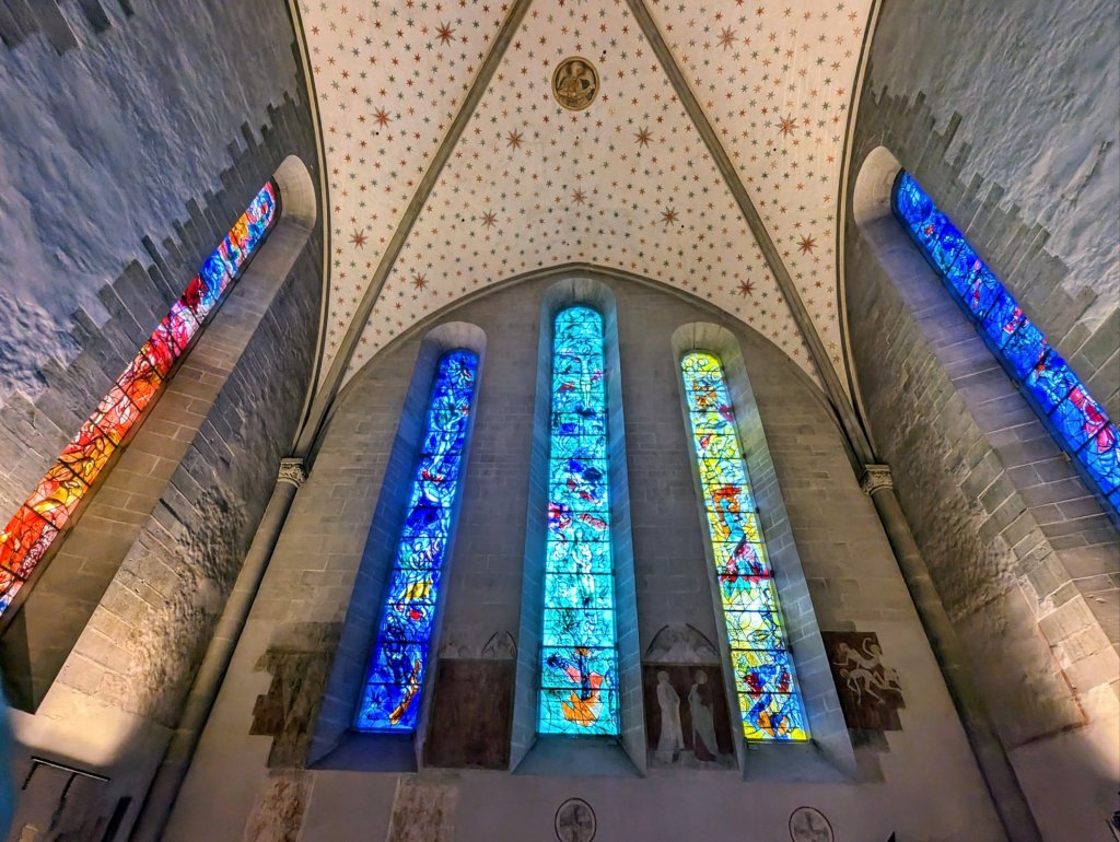 However, in 1967 the priest approached artist Marc Chagall to design a set of 5 stained glass windows for the church. An anonymous donor paid his fee and all production costs, and in 1970 the pictorial symphony of biblical images was inaugurated in the presence of the then 83-year-old Chagall. They are breathtaking.
