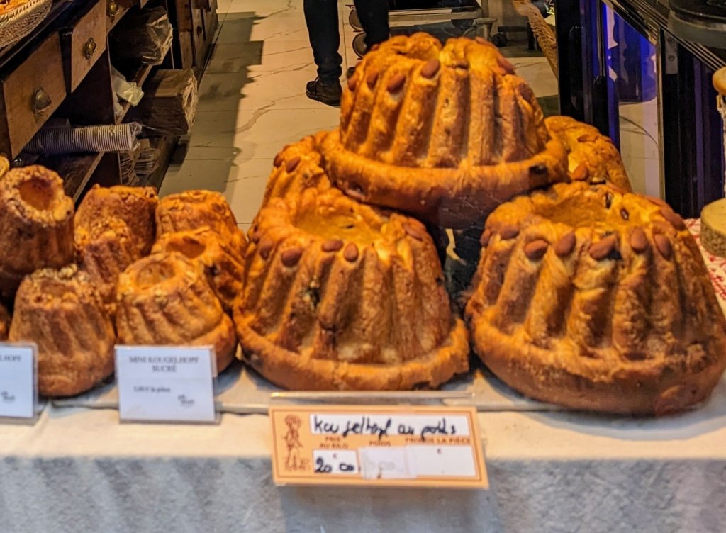 Kougelhoph, made from brioche-type dough stuffed with rum-soaked raisins and topped with almonds. It is baked in a special round fluted pan