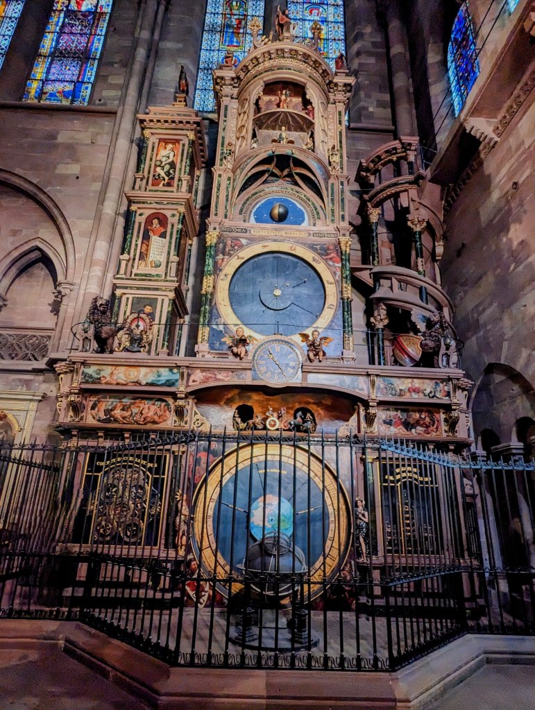 Lacy pink sandstone facadeSoaring sanctuary Magnificent stained glass window above main altarRose WindowAstronomical Clock with sculptures that animate at various times of the day