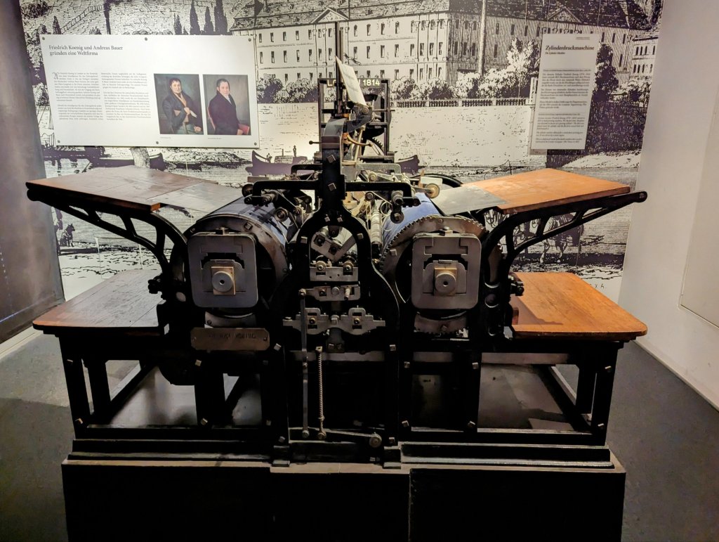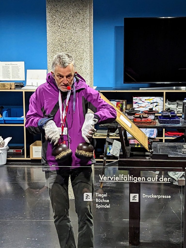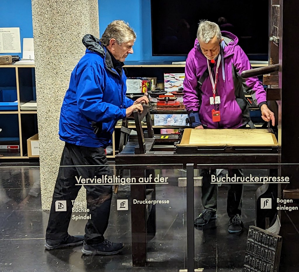 A highlight of our visit to the picturesque city of Mainz was the time we spent at the Gutenberg Museum. Dating back to 1900, the museum celebrates the invention of Mainz’ favorite son, Johannes Gutenberg: the mechanical movable-type printing press. There Doug tried his hand at typesetting and printing (above). We learned not only about the 1439 technological innovation that introduced the age of mass communication, but also about the history of printing and publishing around the world.