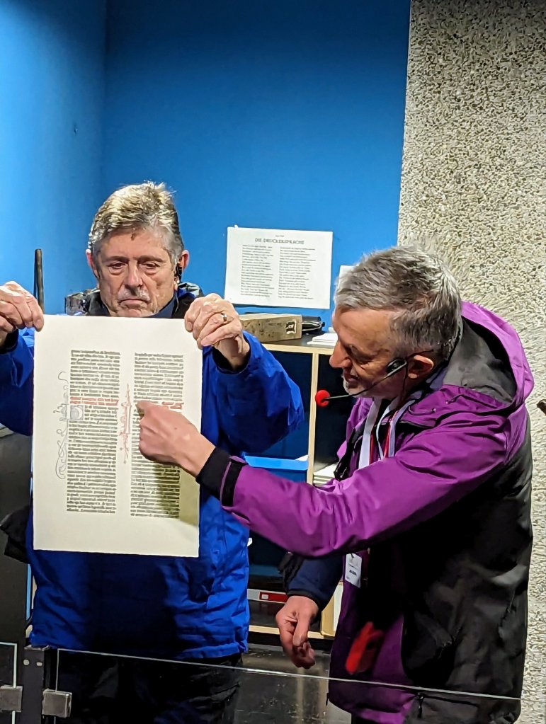 Doug printing a page of the Gutenberg Bible using a replica of the great inventor’s printing press