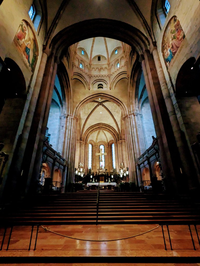 The quiet German town of Speyer is truly a city of spires! Once through the old city gates, one only has to look up to see towers of every kind adorning buildings and providing a fascinating skyline. The Romanesque imperial cathedral towers mark the final resting place for 4 of the most famous holy Roman emperors, 4 kings and 3 empresses. Some of their bones are on display. The term “Protestant” originated here at the Diet of Speyer in 1529.