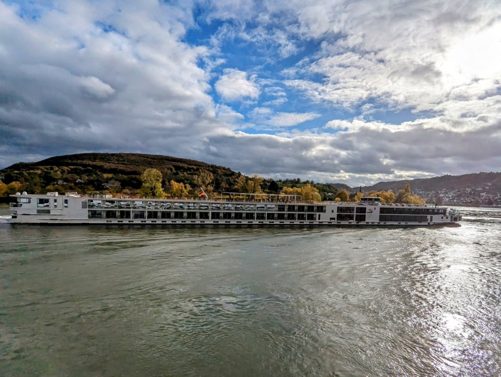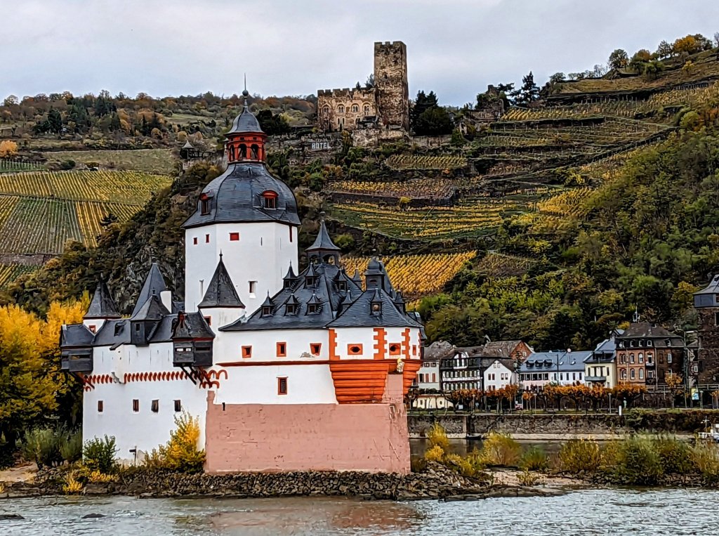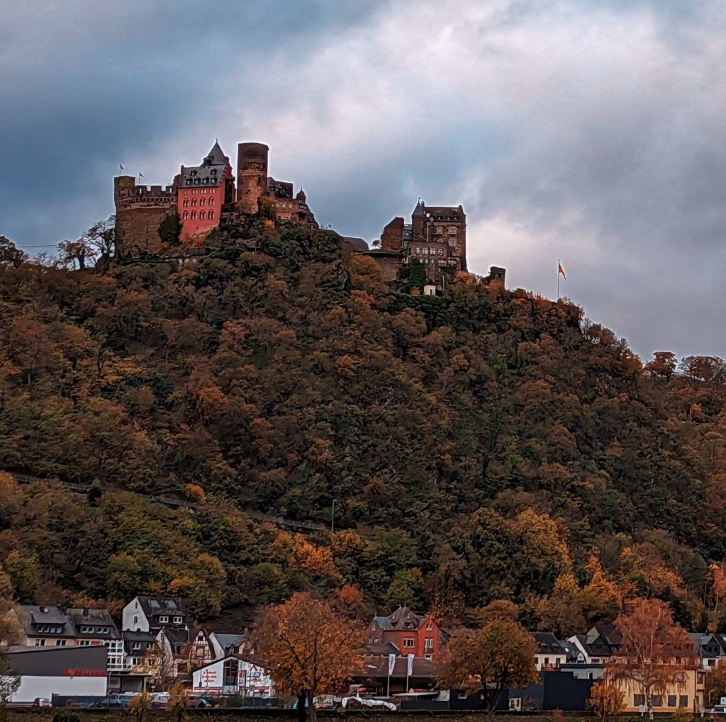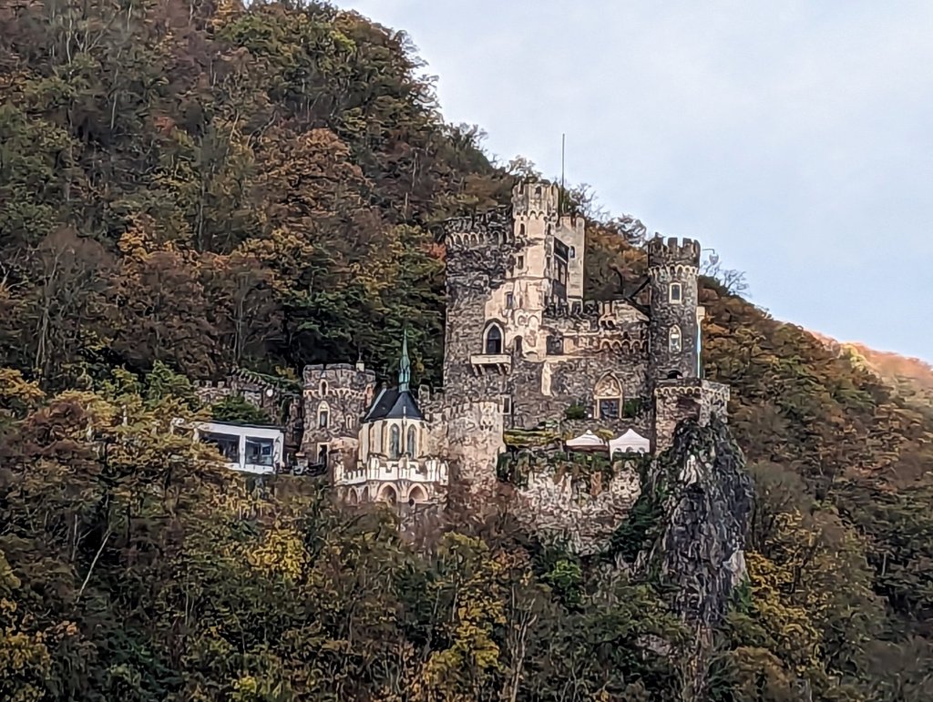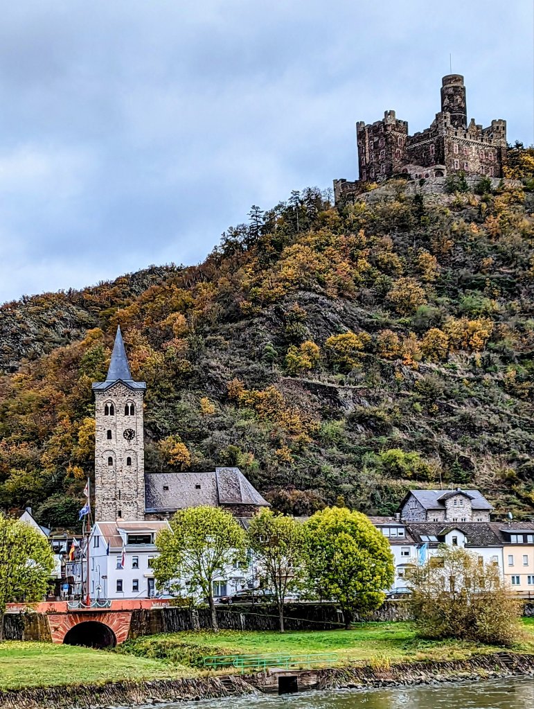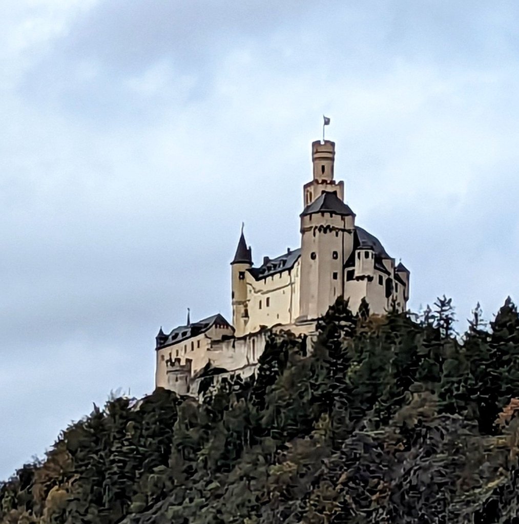 This chilly morning we donned multiple layers of warm clothes and made our way to the sun deck. The forecast was cold and rain, but fortified with blankets and steaming hot chocolate with rum (yum !) we settled in for the most beautiful 40-mile stretch of the Middle Rhine between Bingen and Koblenz.